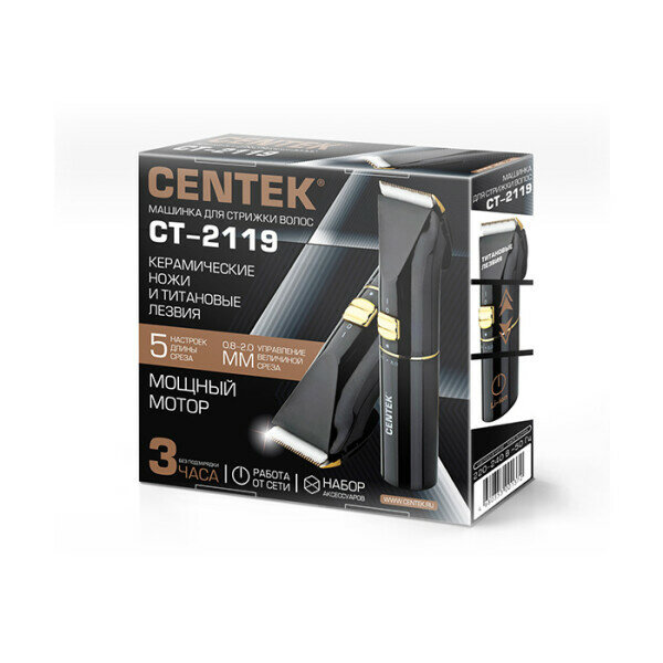 Машинка для стрижки Centek CT-2119 (черный/золотой) сеть/аккум, ножититан+керамика, 180 мин от батареи