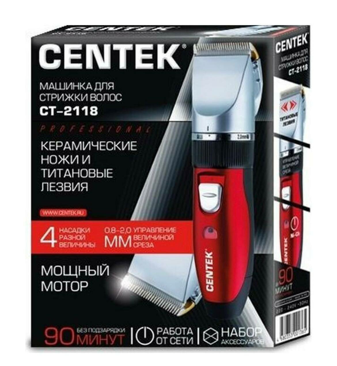 Машинка для стрижки Centek CT-2118 (черный/красн) сеть/аккум, ножититан+керамика, 90 мин. от батареи