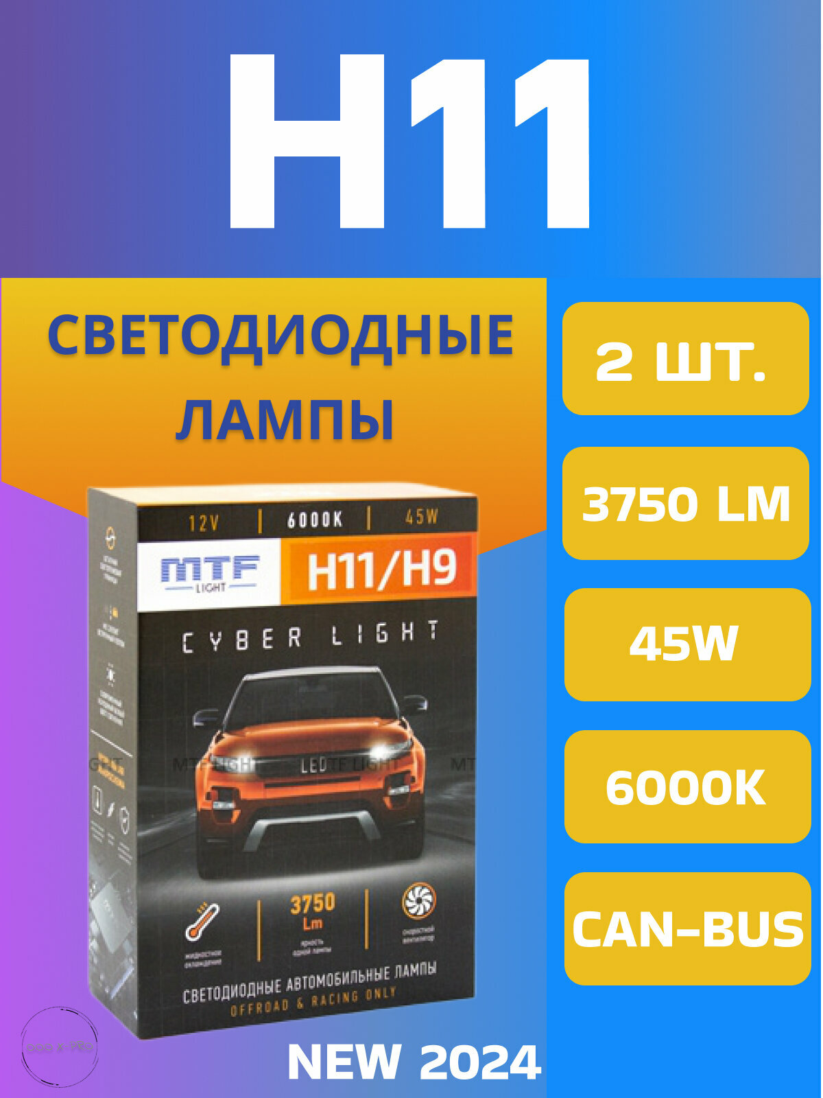 Светодиодные лампы MTF Light, серия CYBER LIGHT, H11/H9, 12V, 45W, 3750lm, 6000K, кулер, комплект.