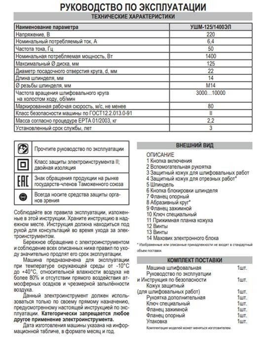 | Комплектация | кожух защитный, рукоятка дополнительная, ключ специальный, фланец зажимной, фланец опорный |