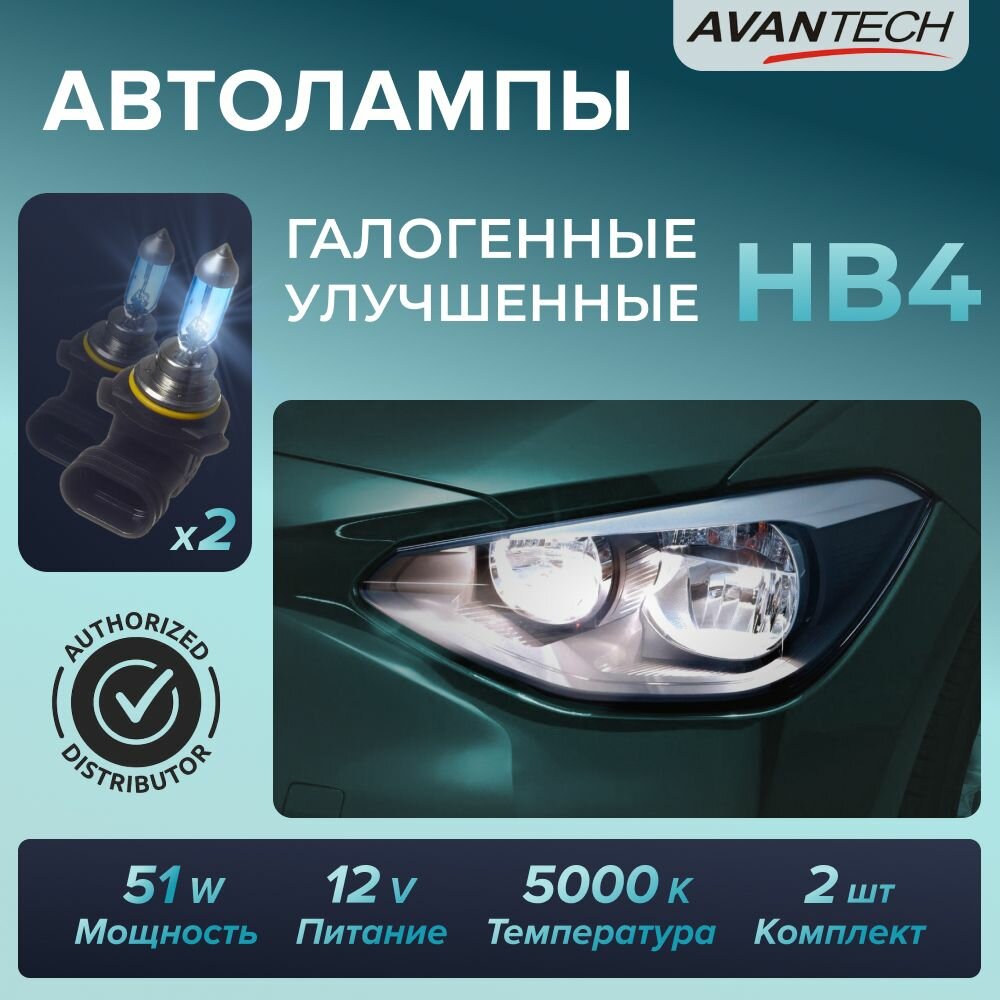 Лампа автомобильная галогеновая высокотемпературная Avantech HB4 12V 55W (110W) 5000K, комплект 2 шт. арт. AB5006