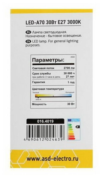 Светодиодная лампа ASD LED-A70-std 30Вт 230В Е27 3000К 2700Лм 4690612024639 . интересное: