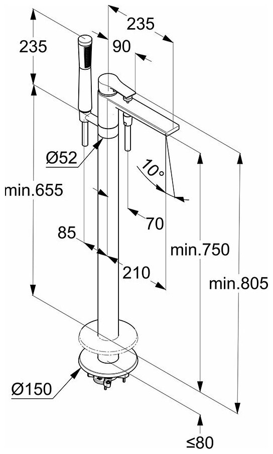 Смеситель для ванны и душа KLUDI ZENTA SL DN 15, для отдельно стоящих ванн, однорычажный, хром (485900565)