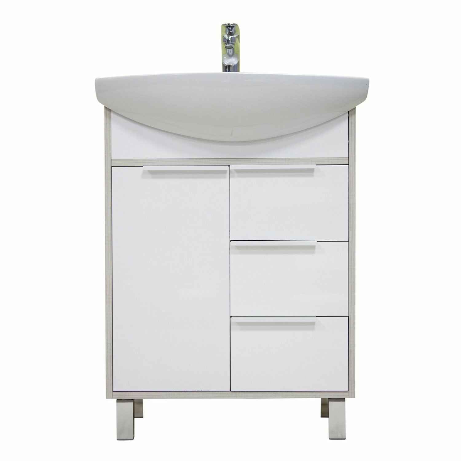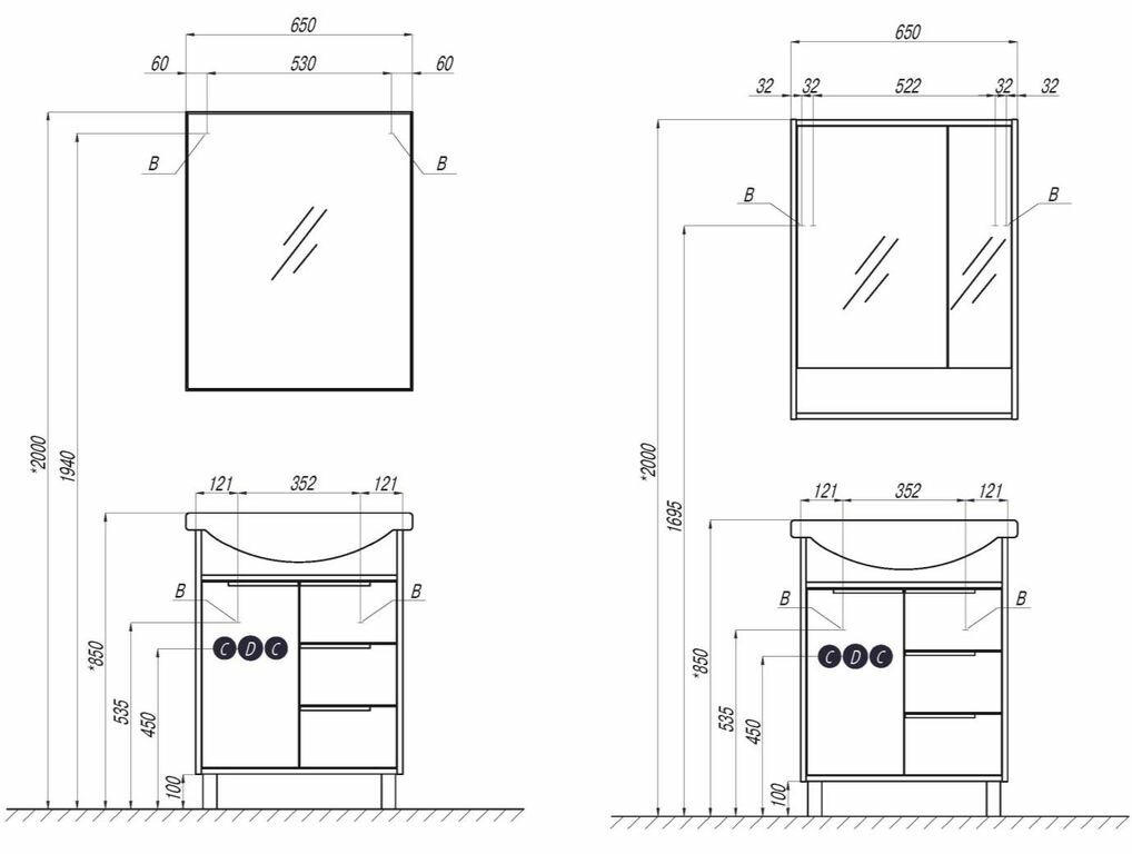 | Комплектация | 1 распашная дверь, 1 регулируемая по высоте полка, 3 выдвижных ящика, опорные ножки, раковина Акватон Смайл-65 |