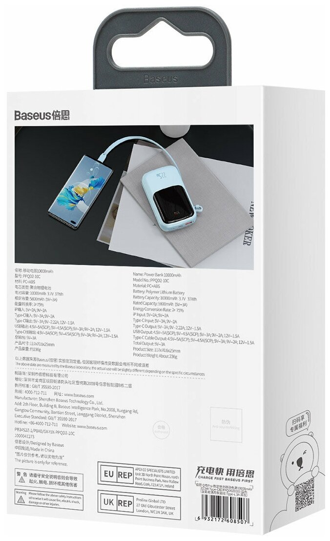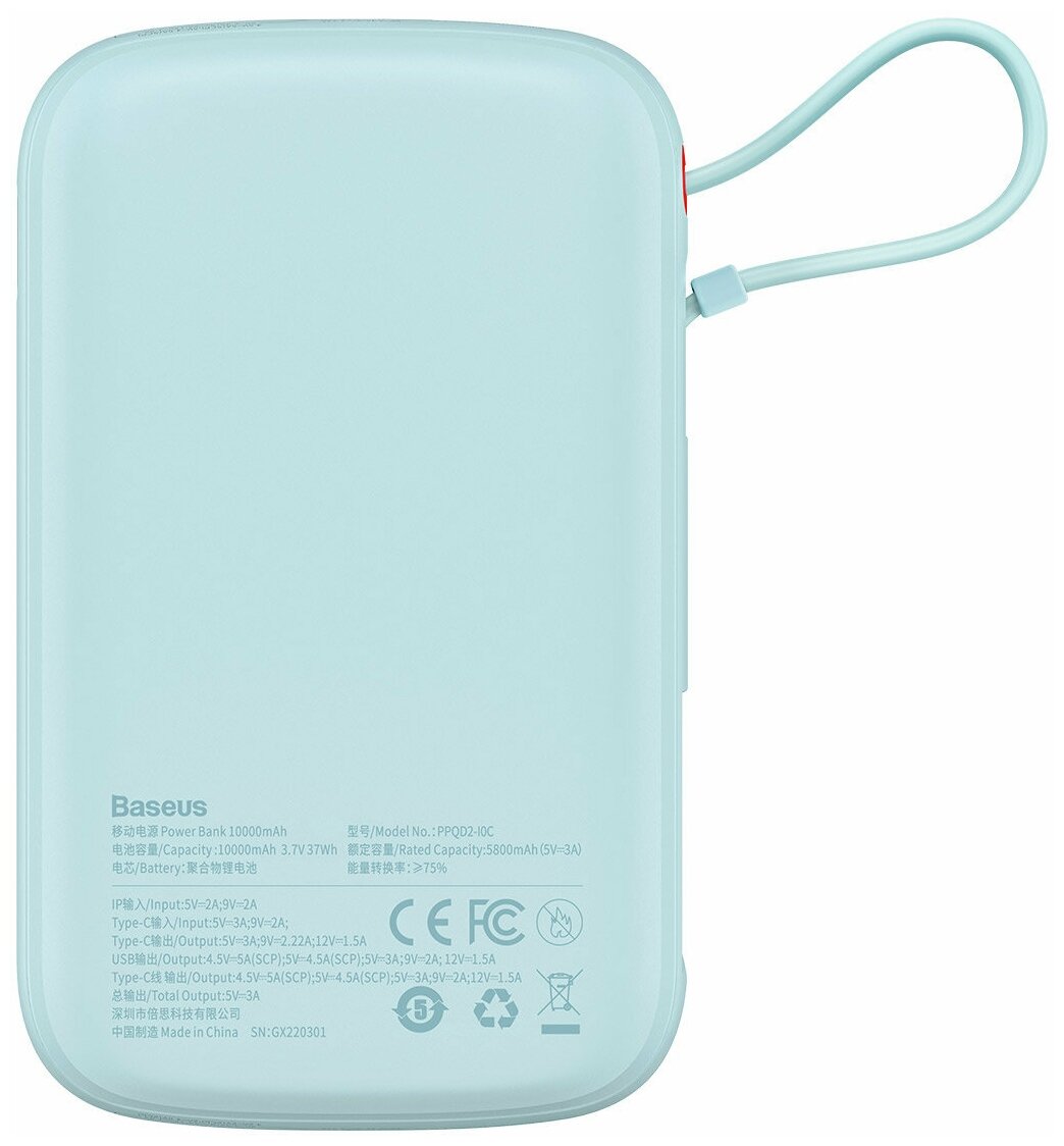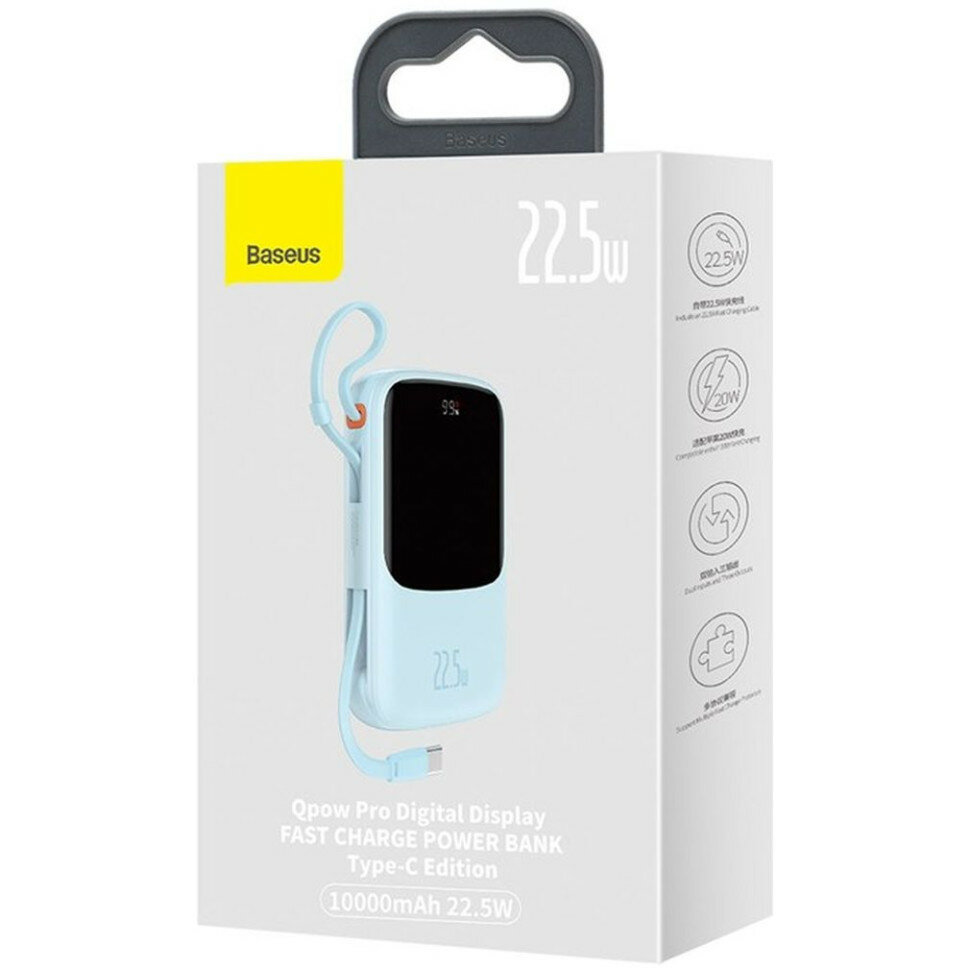 Портативный аккумулятор BASEUS Qpow Pro Digital display fast charge Type-C Edition,10000 mAh, 22.5W, с кабелем Type-C, Голубой, PPQD020103