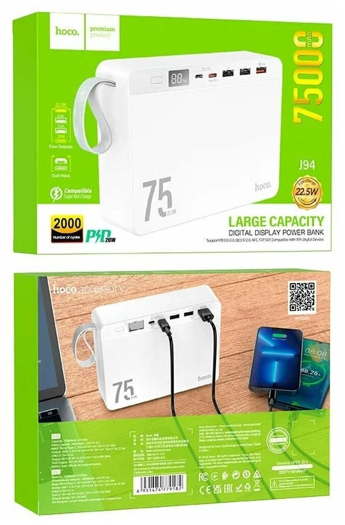 Внешний аккумулятор HOCO J94 Overlord 75000 mAh, 22.5W белый интересное: