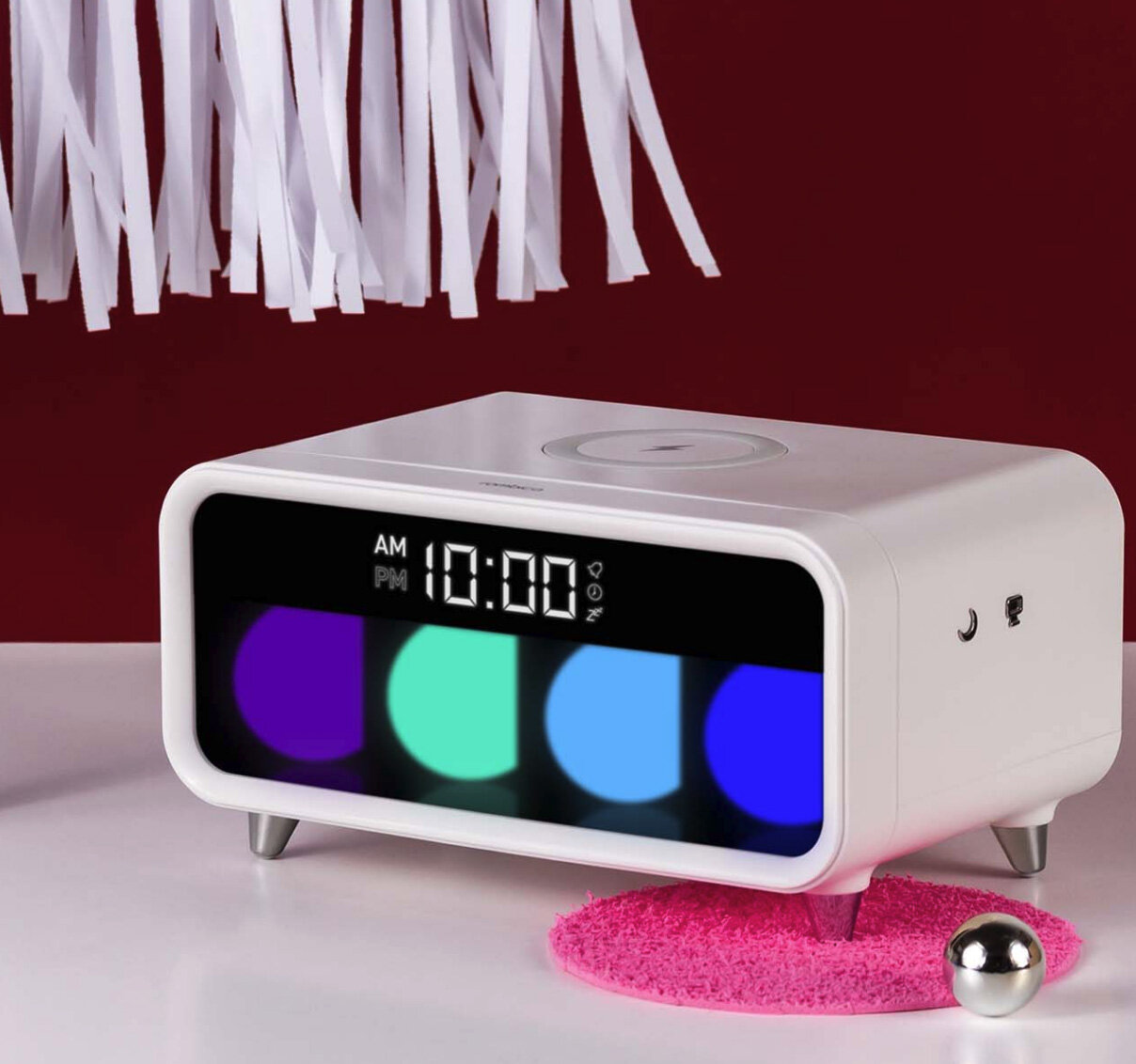 | Дополнительная информация | часы/будильник, сенсорное управление; RGB-подсветка 3 режима; совместимо с устройствами, изготовленными по стандарту Qi; габариты:17 х 11 х 9 см |