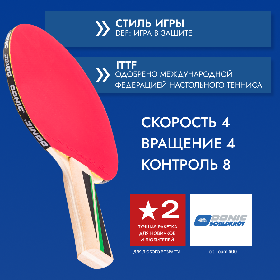 Ниже Вы можете прочитать отзывы на Ракетка для настольного тенниса Donic Schildkrot Top Team 400, ознакомится с подробными характеристиками, посмотреть интересные обзоры и фотографии на Ракетка для настольного тенниса Donic Schildkrot Top Team 400.