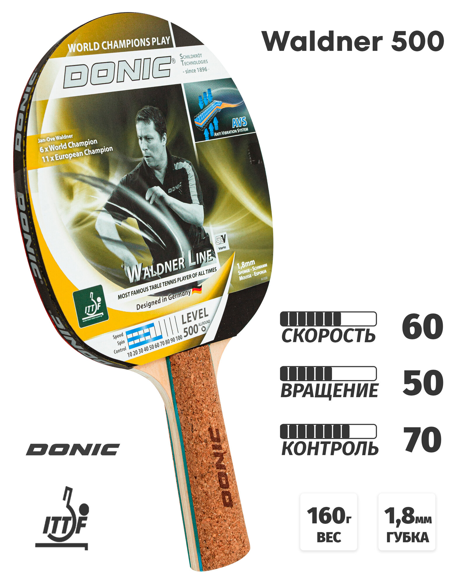 Ракетка для настольного тенниса DONIC-Schildkrot Waldner 500 (пробковая ручка) интересное: