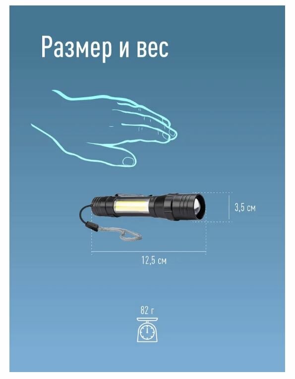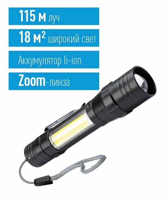 Фонарь аккумуляторный ручной LED 1Вт + COB 5Вт линза зум аккум. Li-ion 18650 1А.ч USB-шнур ABS-пластик космос KOS113Lit