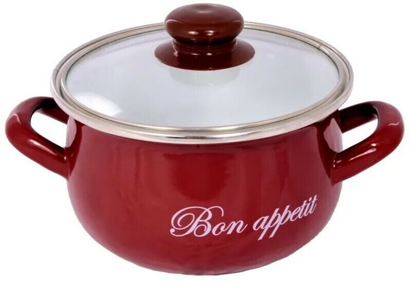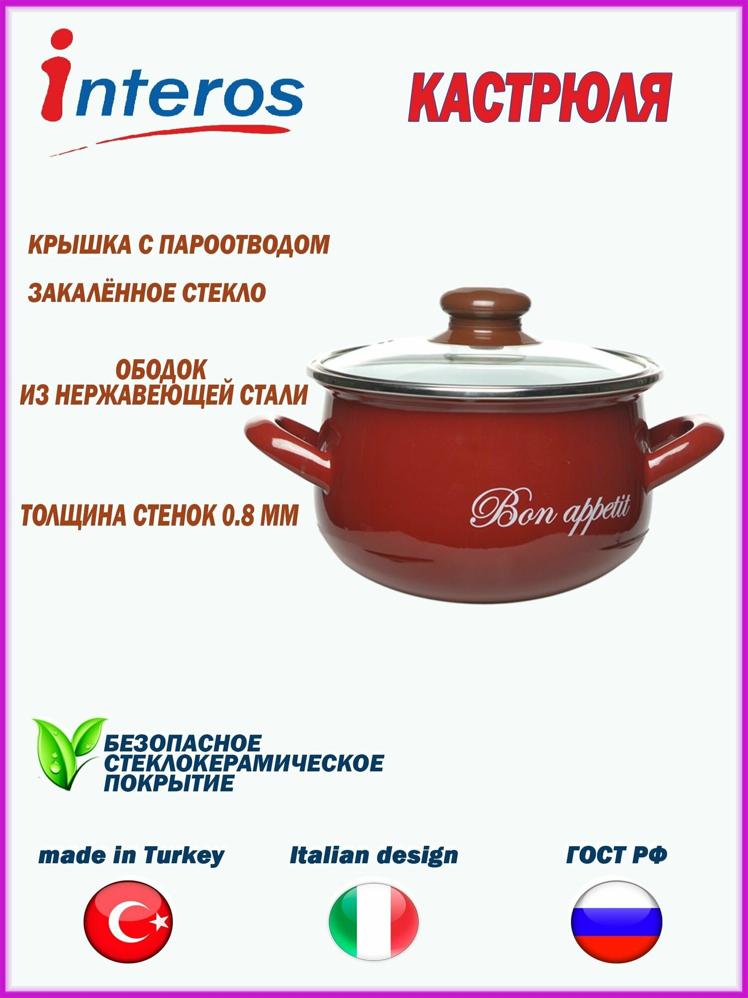 Кастрюля из эмалированной стали для приготовления на плите Interos "Бордо", стеклянная крышка, 2,1 л