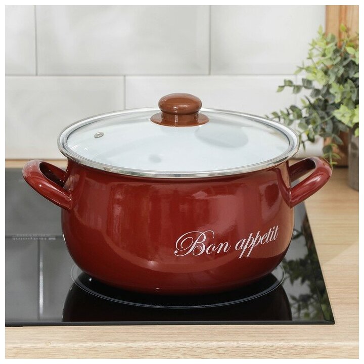Кастрюля эмалированная 4 л "Бордо", стеклянная крышка, цвет красный