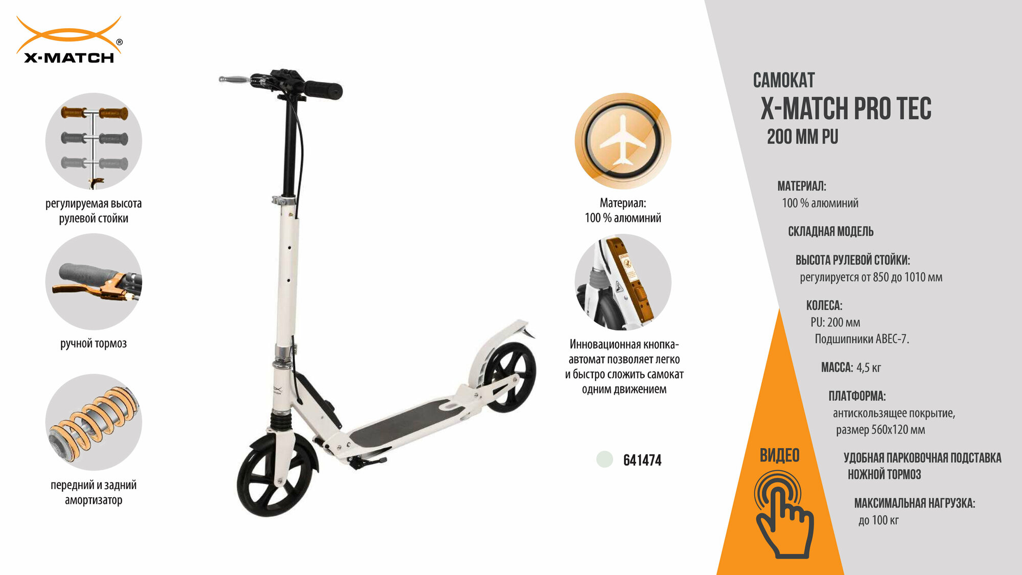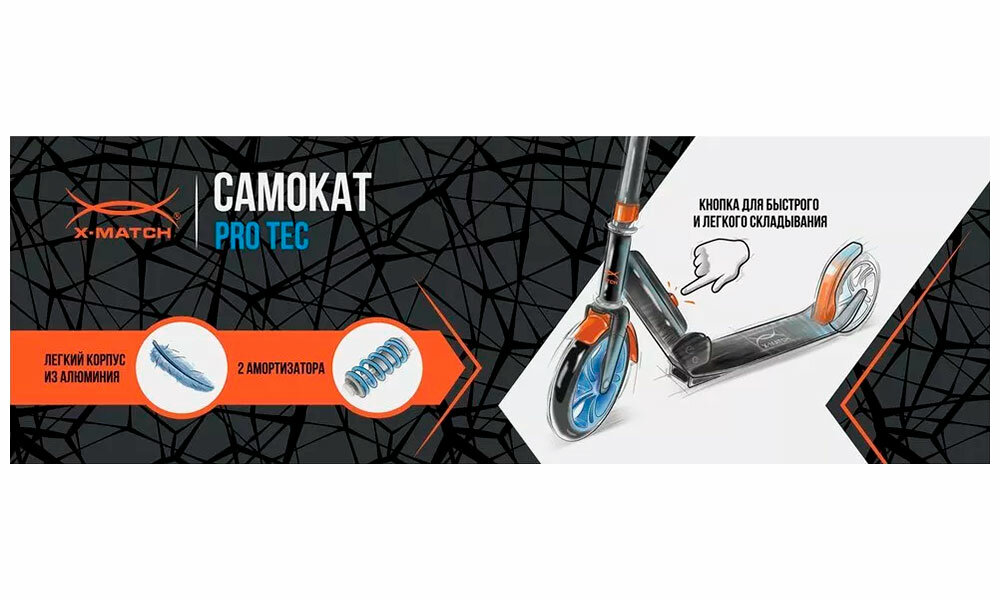 Самокат X-Match ProTec, 100 % алюм., 200 мм PU, 2 аморт., ручной тормоpз, склад. кнопкой автомат интересное: