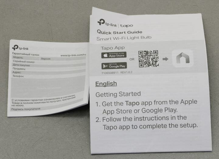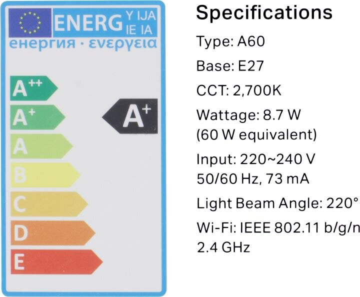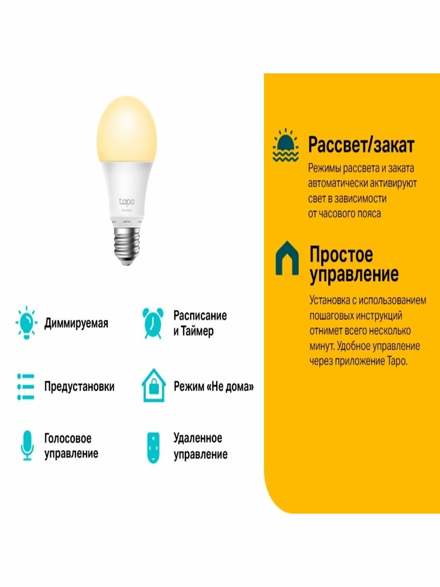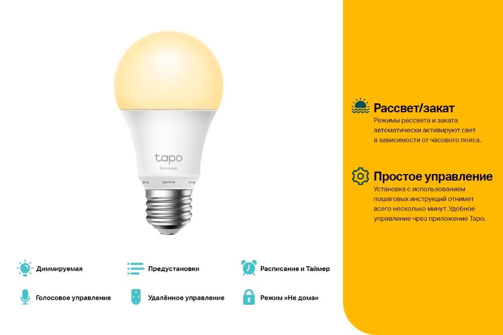 | Дополнительная информация | для взаимодействия требуется установить приложение Tapo; диммируемая; удаленное управление; голосовой контроль; расписание и таймер; мониторинг энергопотребления; режим "не дома"; угол свечения: 220 градусов |