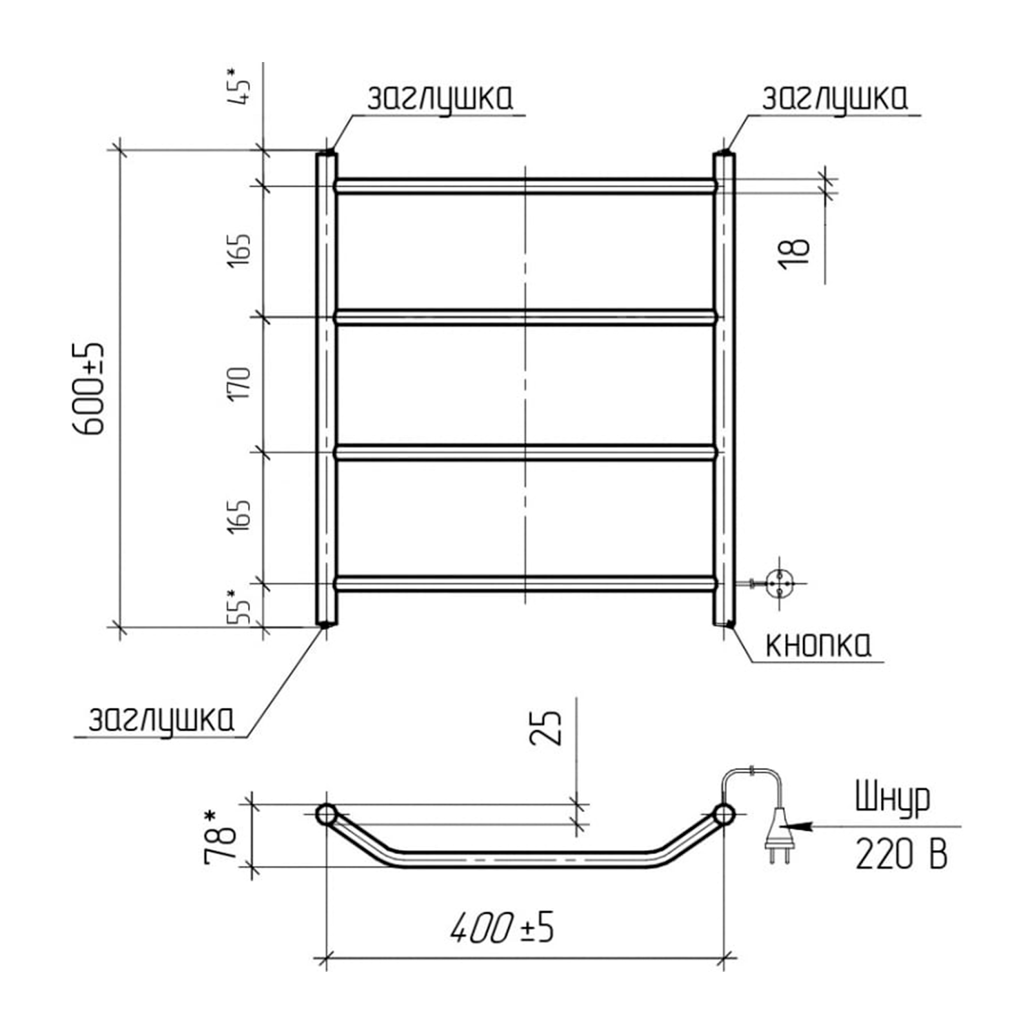 Полотенцесушитель электрический ZEIN PE-05, "Виктория", 400х600 мм, 4 перекладины, черный