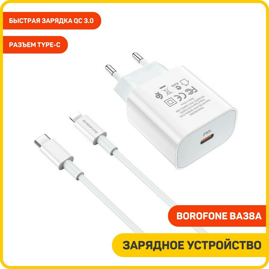 Сетевое зарядное устройство (СЗУ) Borofone BA38A Plus QC 3.0 (Type-C PD) + кабель Type-C-Lightning, 3 А, белый