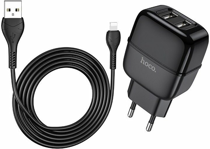 Сетевое зарядное устройство (СЗУ) Hoco C77A (2 USB) + кабель Lightning, 2.4 А, черный
