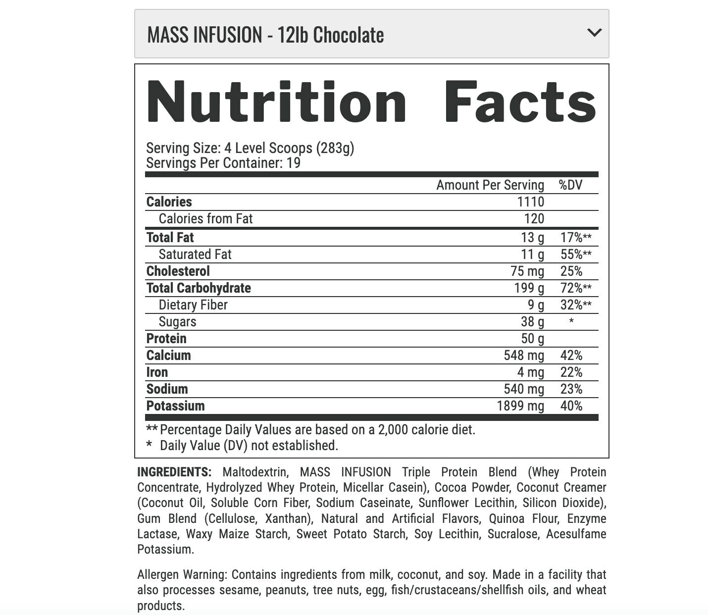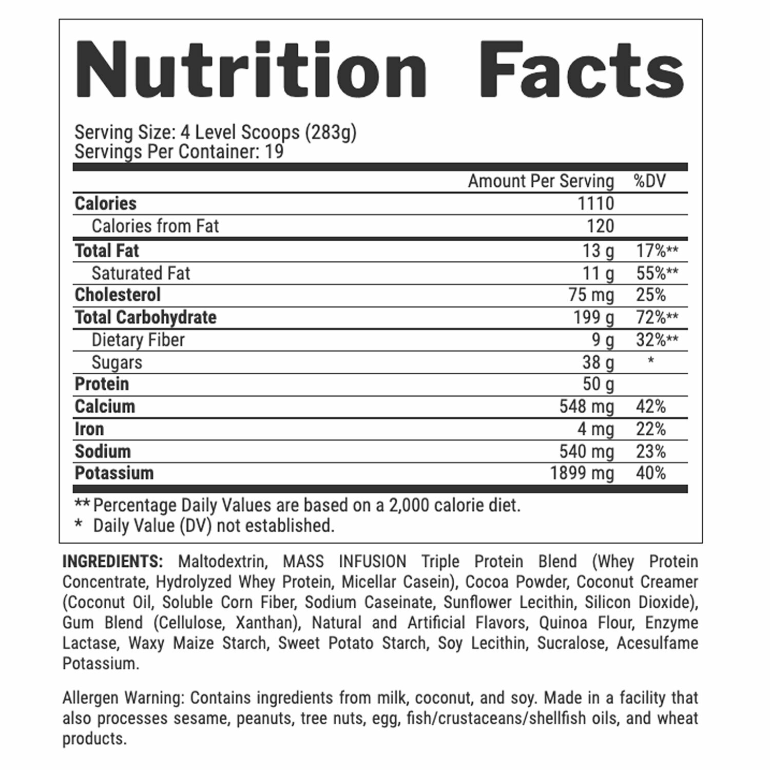 | Дополнительная информация | состав: мальтодекстрин, тройная протеиновая смесь MASS INFUSION (концентрат сывороточного протеина, гидролизованный сывороточный протеин, мицеллярный казеин), какао-порошок, кокосовые сливки (кокосовое масло, растворимое кукурузное волокно, казеинат натрия, лецитин подсолнечника, диоксид кремния), смесь жевательной резинки (целлюлоза, ксантан), натуральные и искусственные ароматизаторы, мука киноа, фермент лактаза, восковой кукурузный крахмал, крахмал сладкого картофеля, соевый лецитин, сукралоза, ацесульфам калия. Предупреждение об аллергенах: содержит ингредиенты из молока, кокоса и сои. Сделано на предприятии, которое также перерабатывает кунжут, арахис, лесные орехи, яйца, масло рыбы/ракообразных/моллюсков и продукты из пшеницы. |