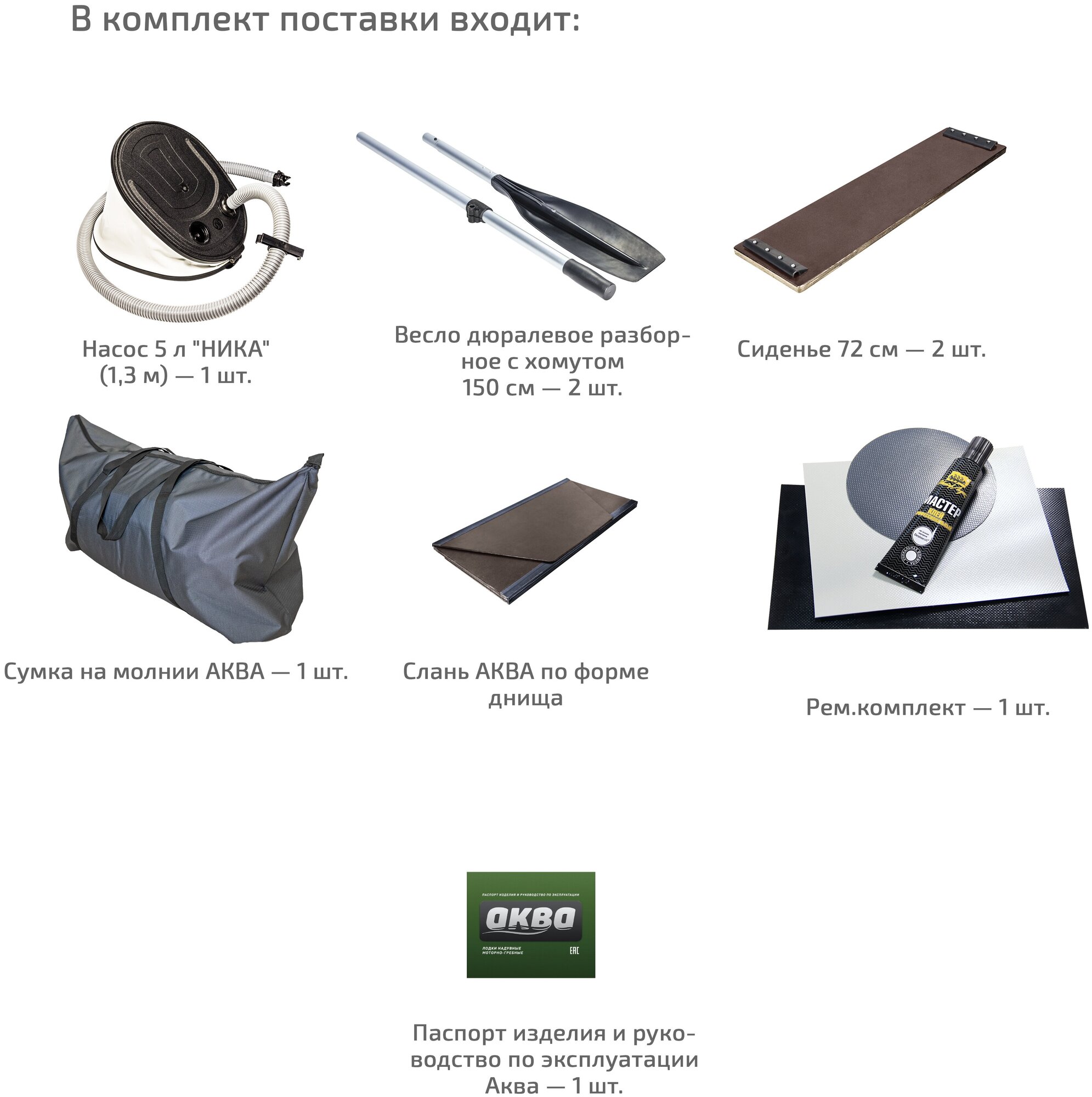| Состав набора | Насос 5 л "НИКА" (1,3 м) — 1 шт. Весло дюралевое разборное с хомутом 150 см — 2 шт. Сиденье 72 см — 2 шт. Сумка-конверт AКВА 2600-2800 — 1 шт. Рем.комплект — 1 шт. Паспорт изделия и руководство по эксплуатации Аква — 1 шт. |