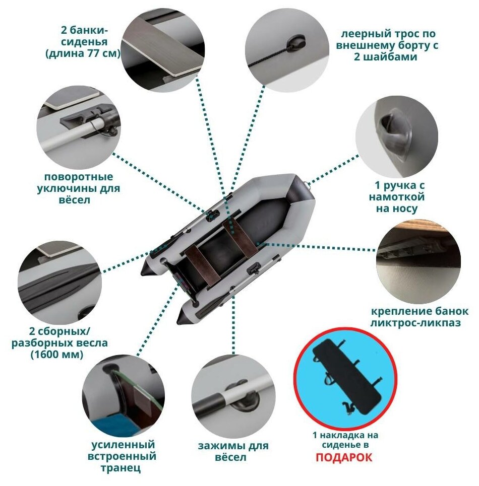 | Состав набора | паспорт - 1 шт весла - 2 шт (160 см) насос - 1шт рем комплект - 1 шт банки (сиденья) - 2 шт сумка для лодки - 1 шт сплошной пол - 1 шт |