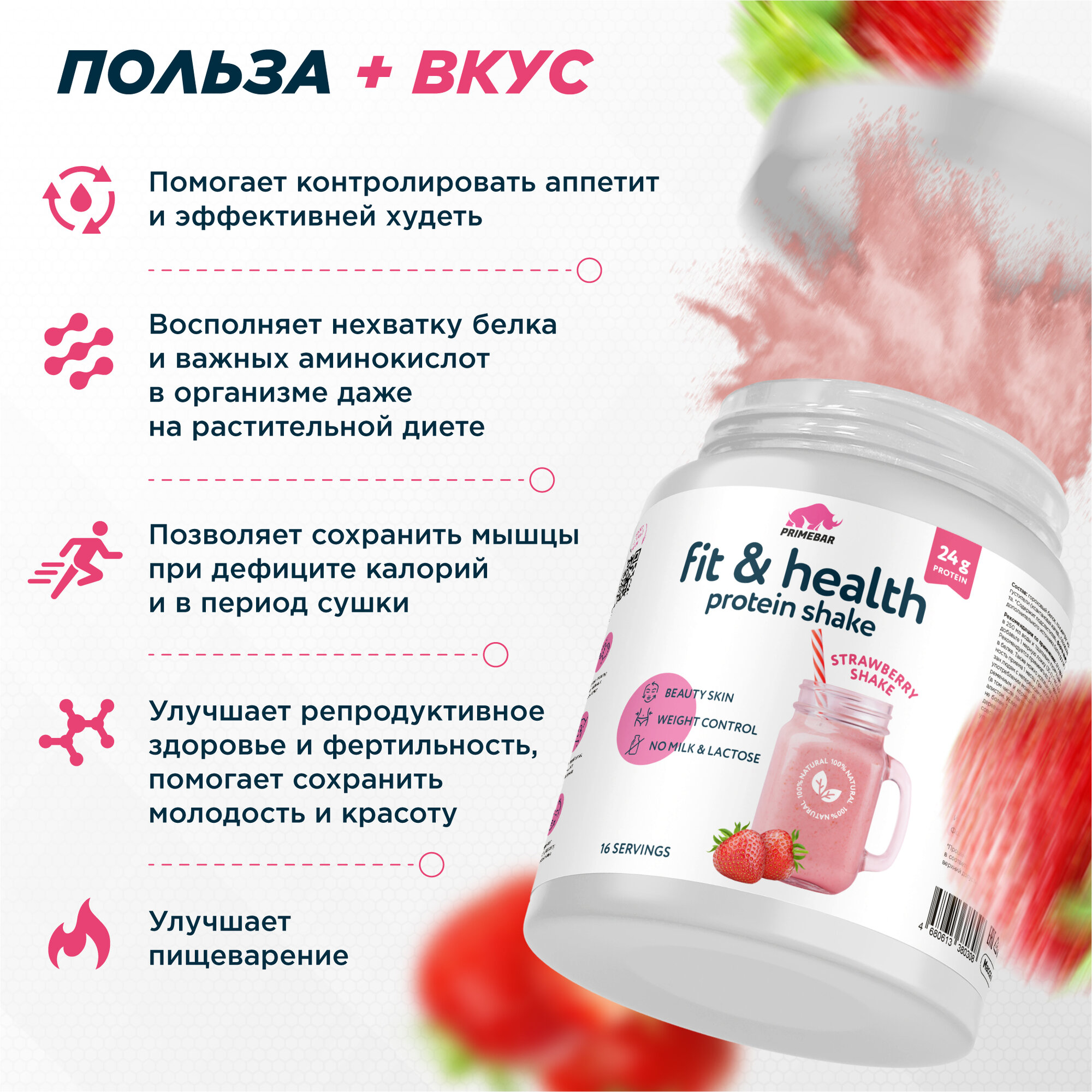 Растительный протеин Fit & Health Protein Shake PRIMEBAR Клубничный коктейль, 500 г / Без лактозы / Гороховый белок