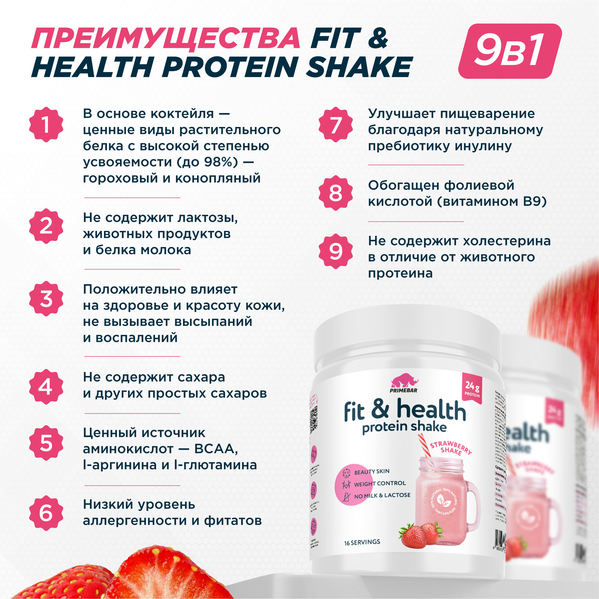 Ниже Вы можете прочитать отзывы на Протеиновый коктейль Fit & Health Protein Shake PRIMEBAR Клубничный коктейль, 500 г / Растительный протеин, ознакомится с подробными характеристиками, посмотреть интересные обзоры и фотографии на Протеиновый коктейль Fit & Health Protein Shake PRIMEBAR Клубничный коктейль, 500 г / Растительный протеин.