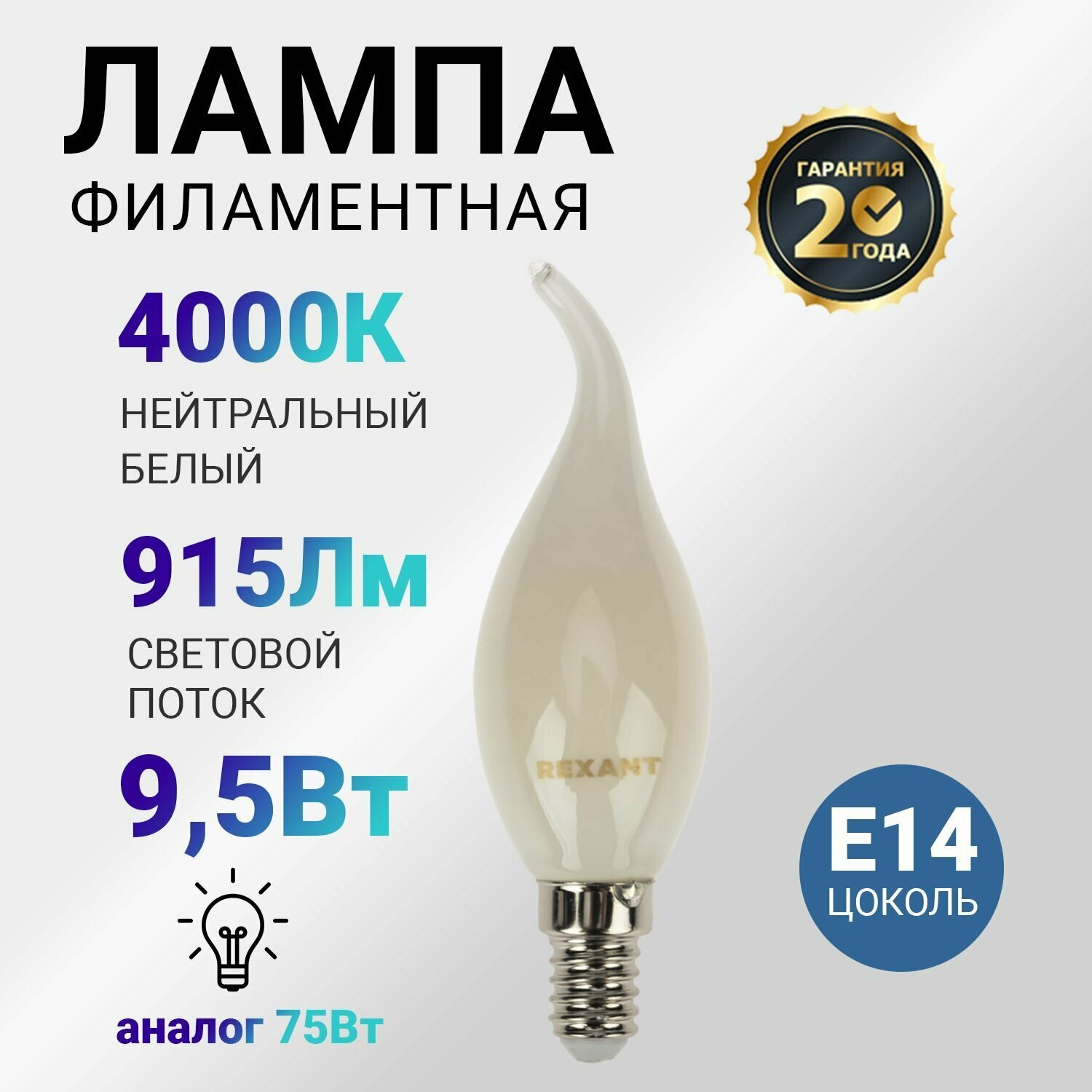 Лампа филаментная REXANT Свеча на ветру CN37, 9.5 Вт, 915 Лм, 4000K, E14 в матовой колбе интересное: