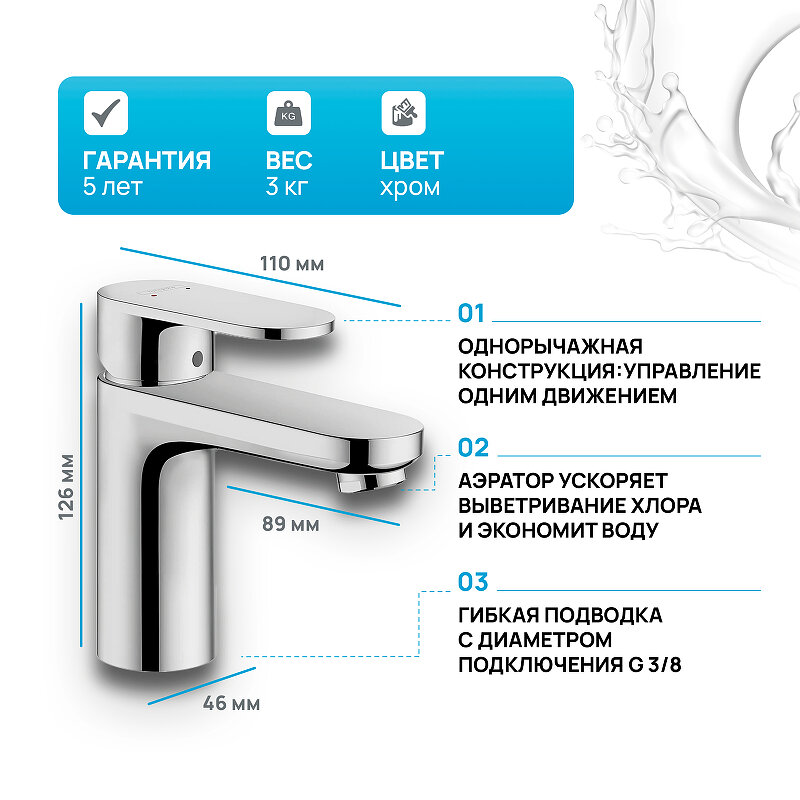 | Минусы: | Короткий выход крана, не для всех раковин |