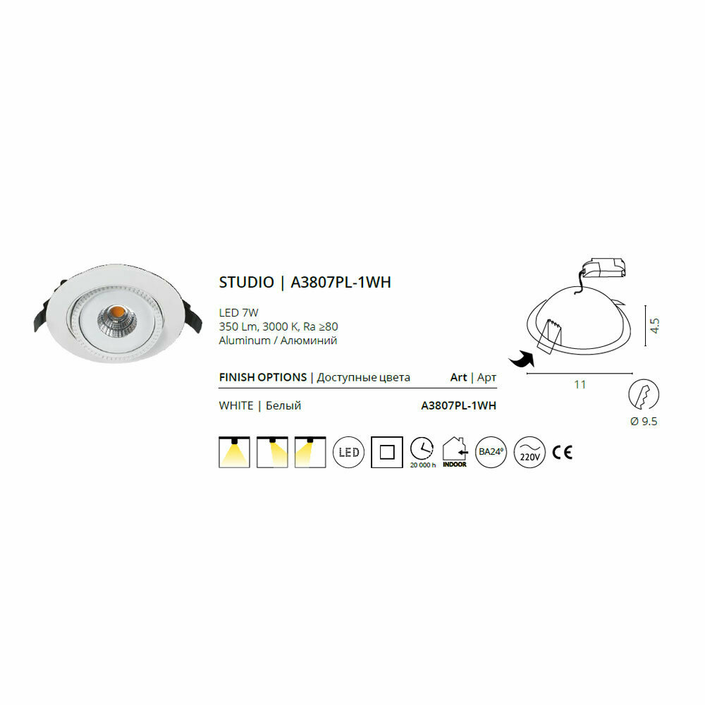 Встраиваемый светильник Arte Lamp STUDIO A3807PL-1WH интересное: