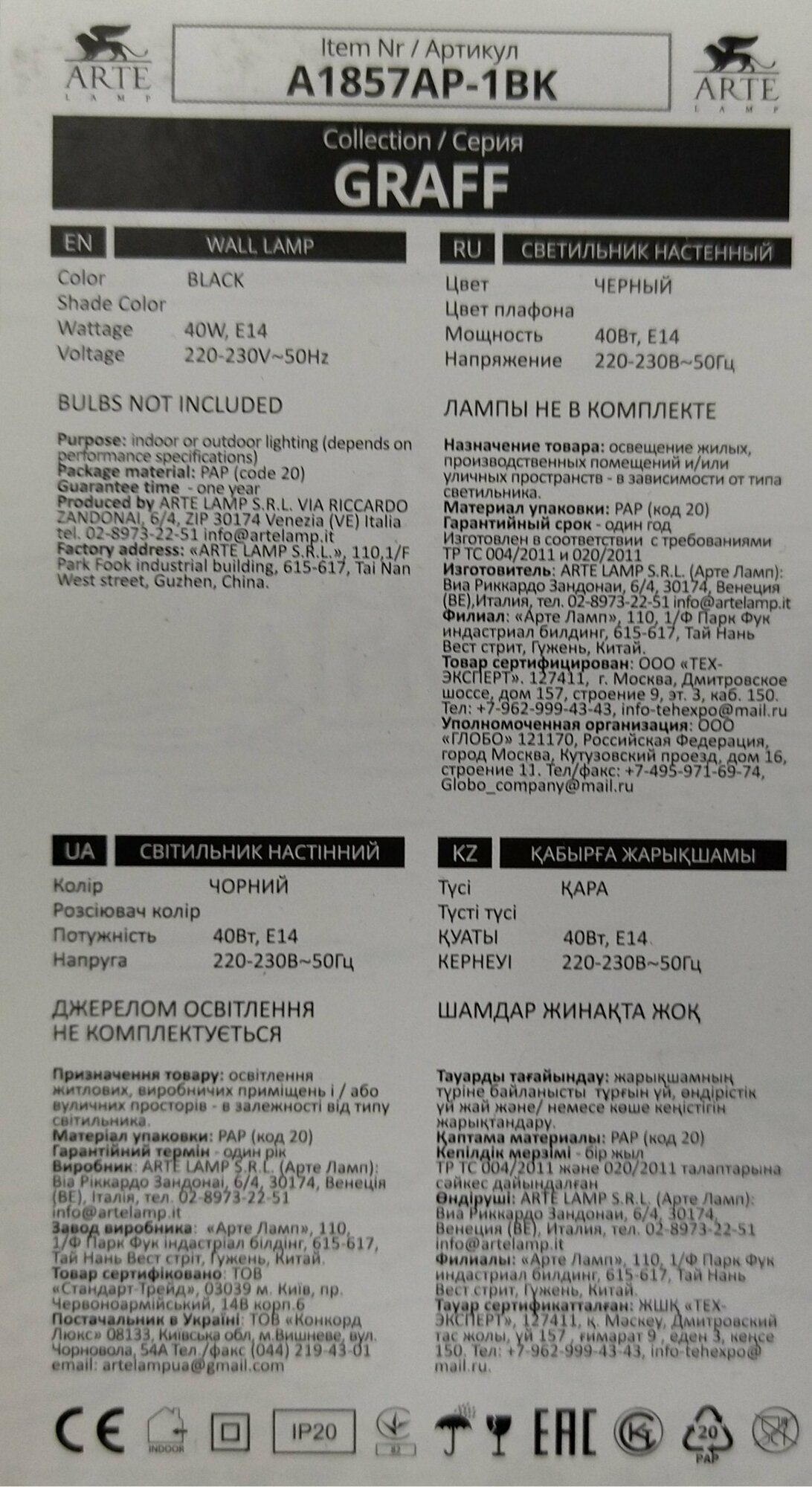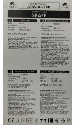 Ниже Вы можете прочитать отзывы на Светильник настенный бра Arte Lamp A1857AP-1BK GRAFF, ознакомится с подробными характеристиками, посмотреть интересные обзоры и фотографии на Светильник настенный бра Arte Lamp A1857AP-1BK GRAFF.