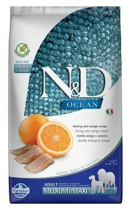 Корм Farmina N&D OCEAN Herring And Orange Medium/Maxi беззерновой для собак средних и крупных пород, сельдь и апельсин, 12 кг