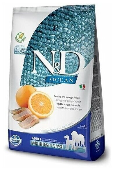 Сухой корм для собак Farmina N&D Ocean Medium & Maxi, беззерновой, сельдь, c апельсином 1 уп. х 1 шт. х 2.5 кг (для средних и крупных пород)