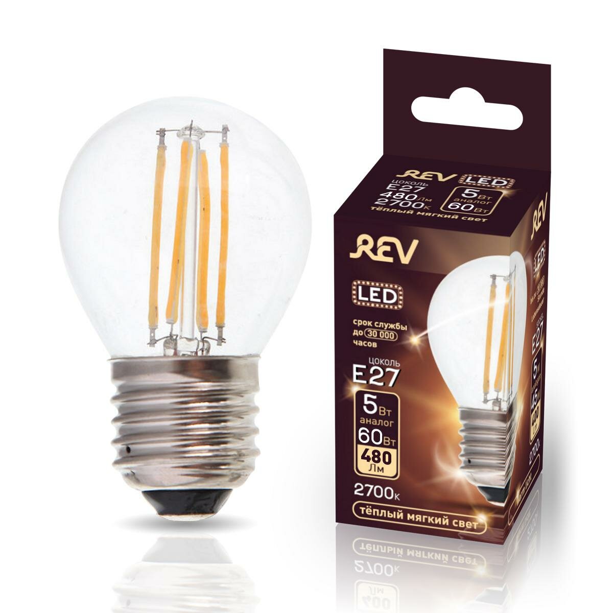 Лампа светодиодная REV 5 Вт E27 филаментная шар G45 2700К теплый белый свет 220 В прозрачная