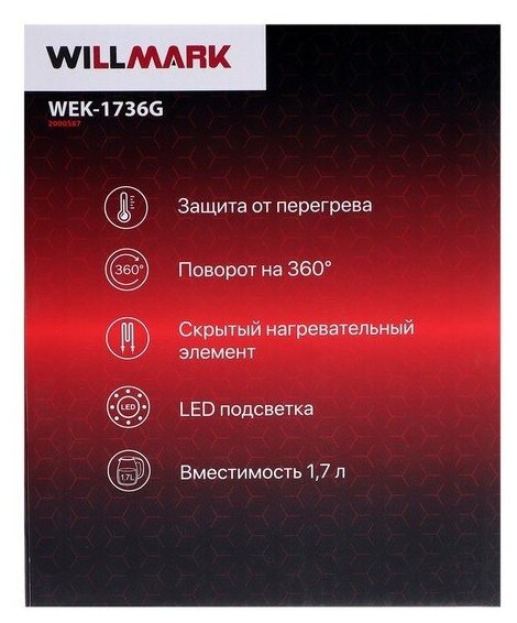 Купить Чайник эл WILLMARK WEK-1736G (1.7л, STRIX контр., LED-подсв., корп. из стекла, 2200Вт, гар.2 года)
