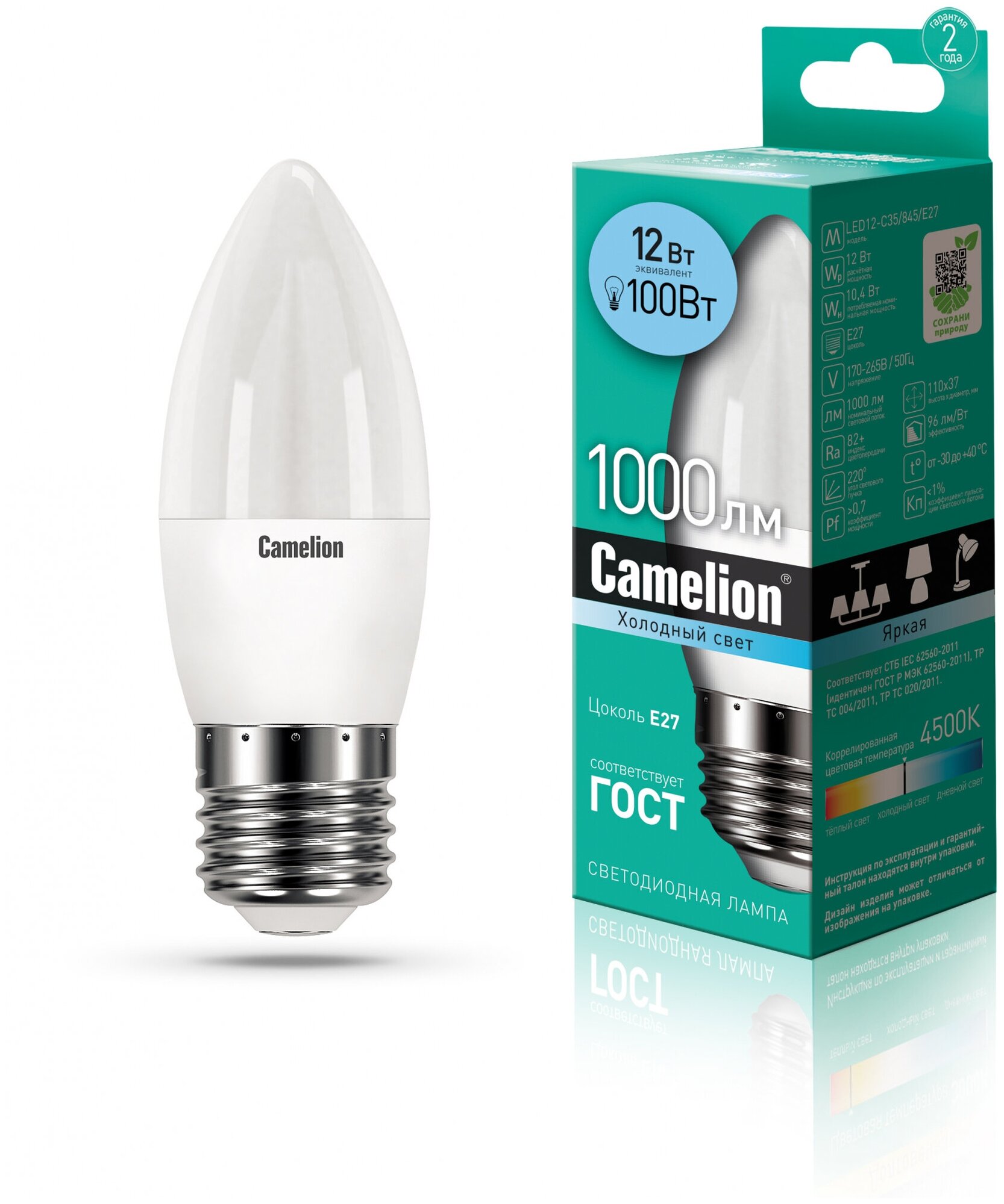 LED лампа свеча 12Вт Е27 4500К(холодный белый свет) - LED12-C35/845/E27 (Camelion) (код заказа 13690 ) интересное: