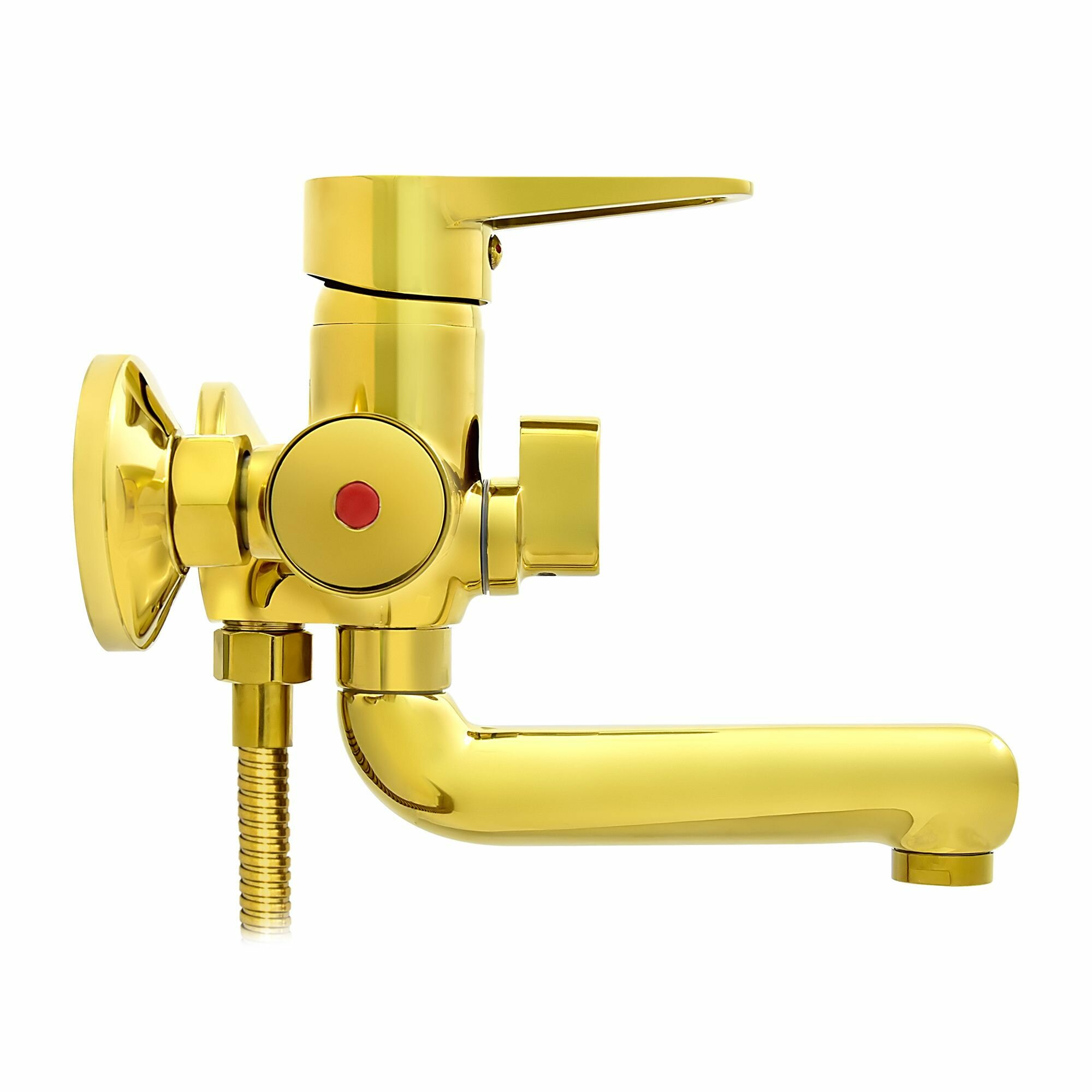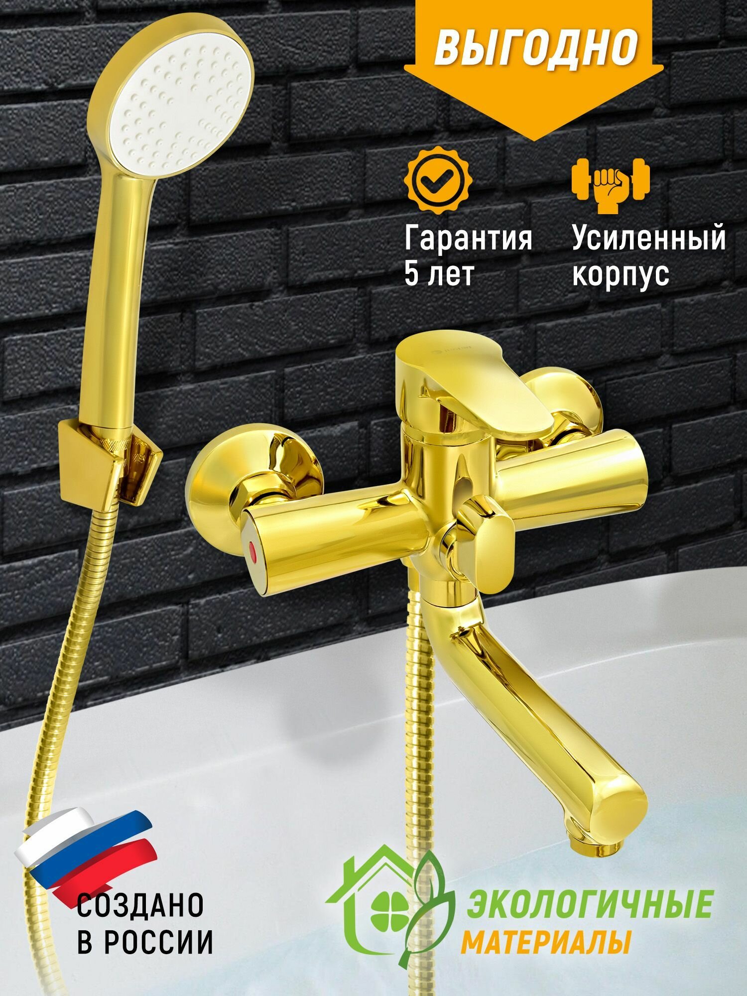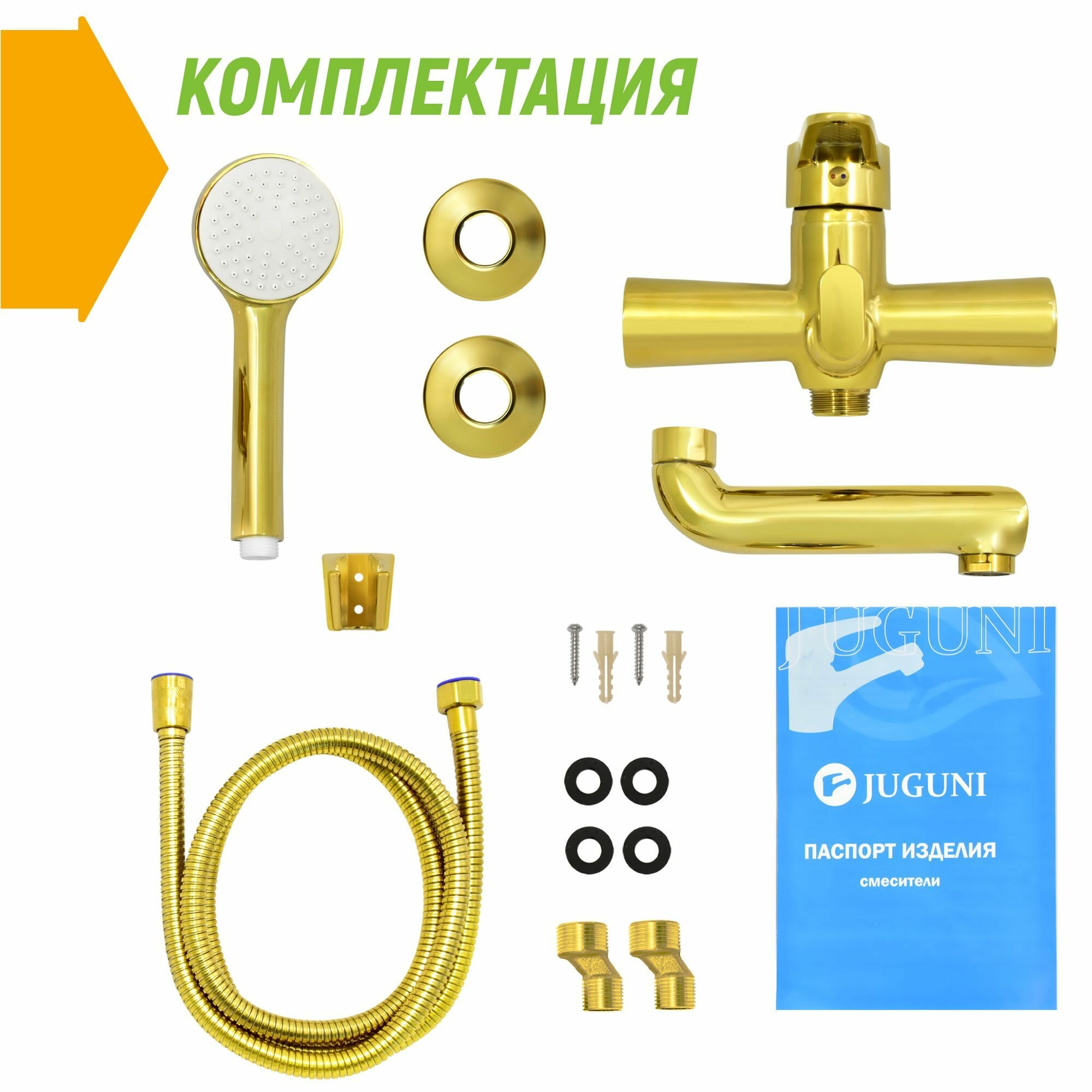 Смеситель для ванны с коротким изливом золотой, шланг 150 см, лейка, Juguni, Арт.: 0402.163 интересное: