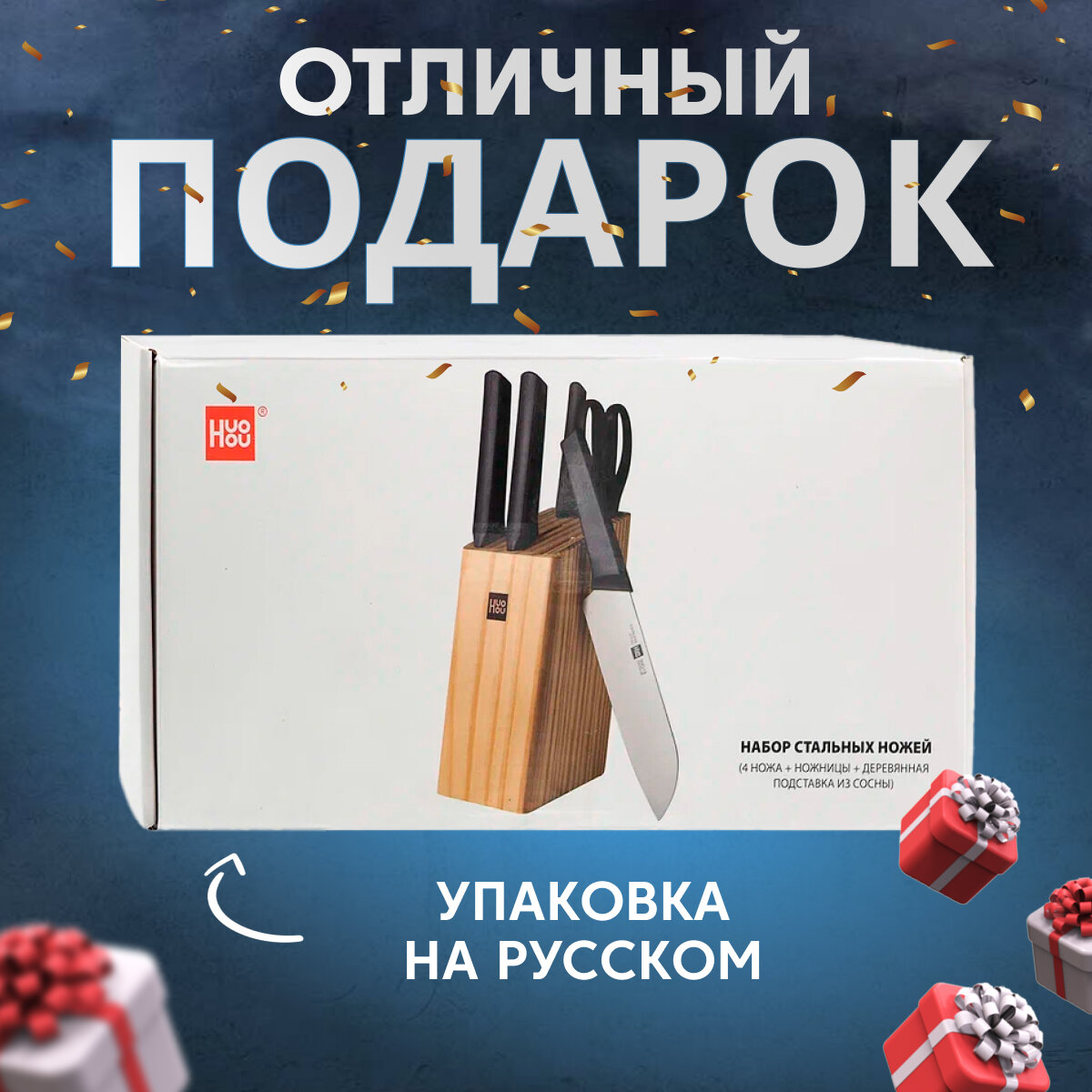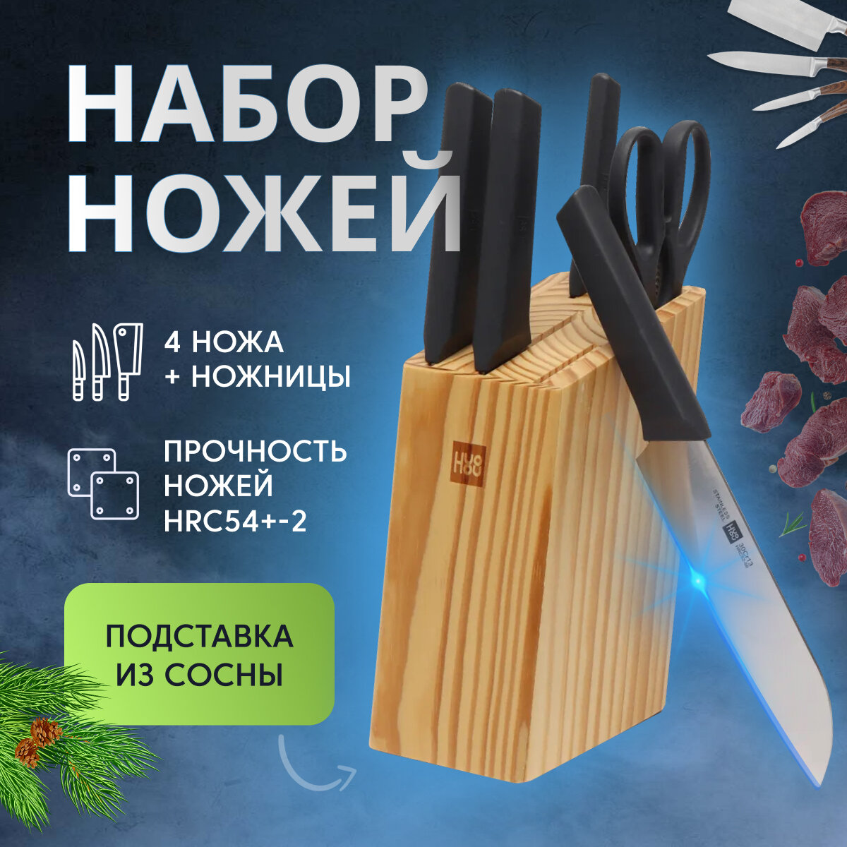 СохранитьНабор стальных ножей (4 ножа + ножницы + деревянная подставка из сосны) HuoHou 6-Piece Kitchen Knife Set Lite (HU0058), русская версия!!!, черный интересное: