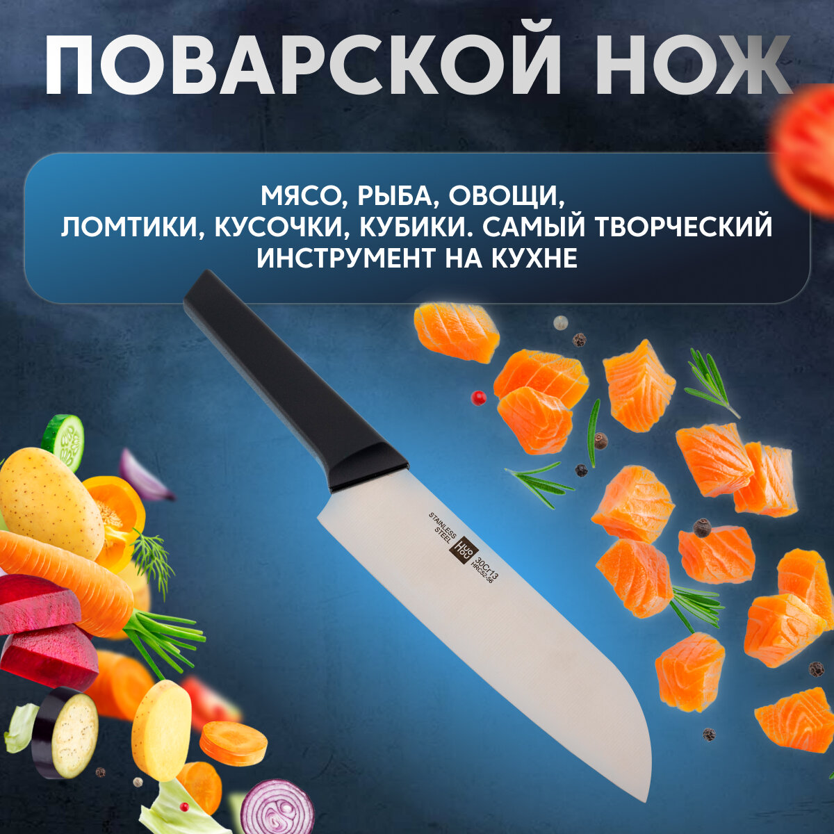 | Типы ножей в наборе | нож сантоку, нож для овощей, универсальный нож, нож-топорик, разделочный нож, шеф-нож |