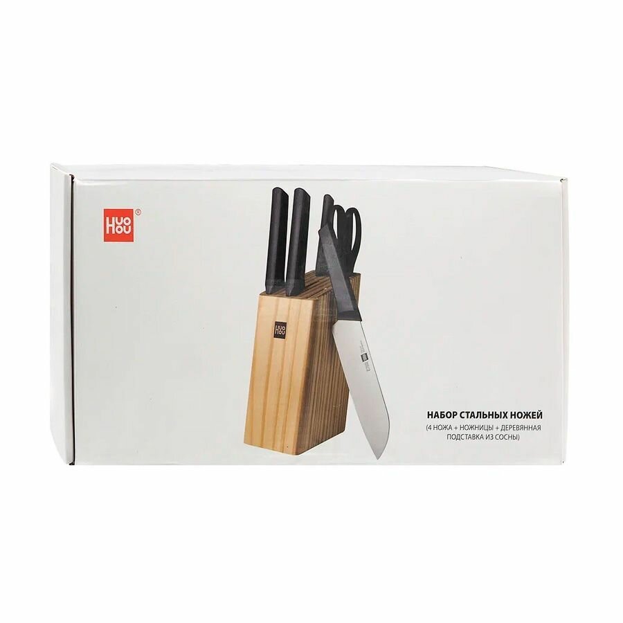 Набор стальных ножей (4 ножа + ножницы + деревянная подставка из сосны) HuoHou 6-Piece Kitchen Knife Set Lite (HU0058), русская версия, черный