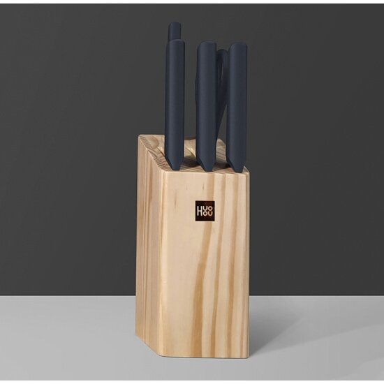 Набор стальных ножей (4 ножа + ножницы + деревянная подставка из сосны) Xiaomi (Mi) HuoHou 6-Piece Kitchen Knife Set Lite , RUS черный
