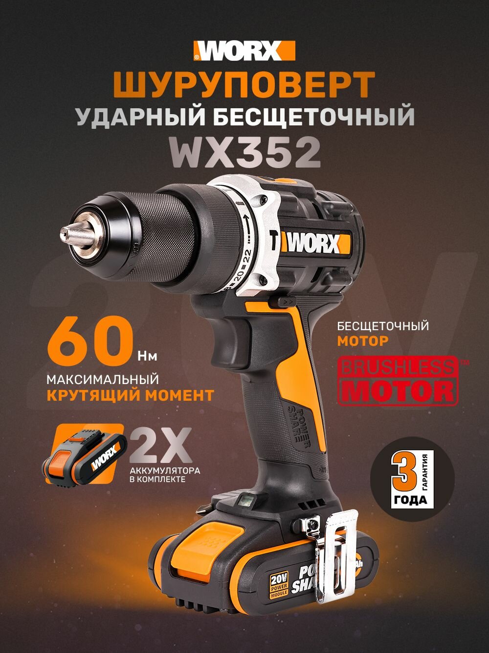 Купить Дрель-шуруповерт ударная аккумуляторная WORX WX352, 60Нм, 20В, бесщеточная, 2Ач x2, ЗУ 2А, кейс