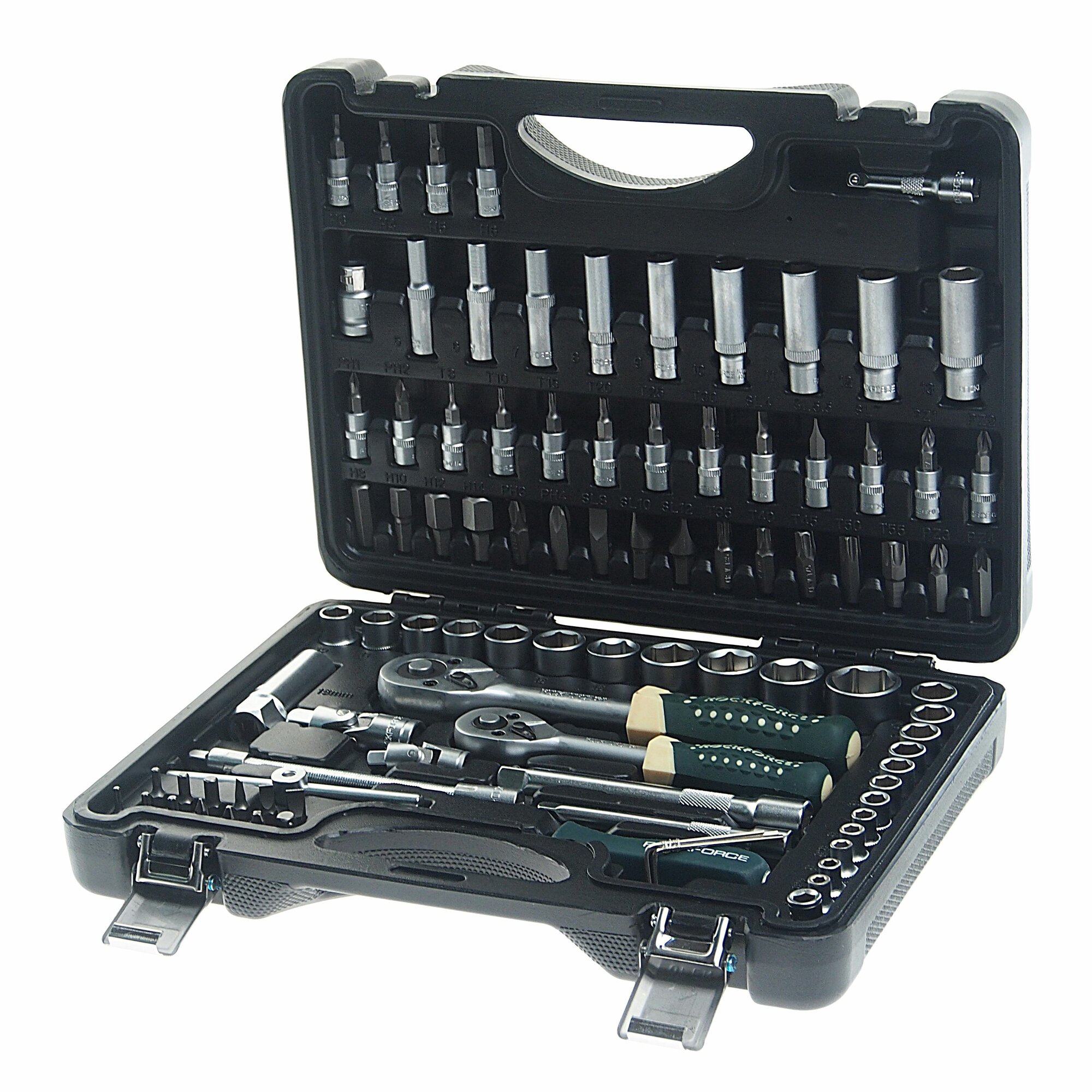 | Головки торцевые подробно | торцевые 6-ти гранные 1/4" длиной 25 мм: 4, 4.5, 5, 5.5, 6, 7, 8, 9, 10, 11, 12, 13, 14 мм; торцевые 6-ти гранные 1/4" длиной 50 мм: 6, 7, 8, 9, 10, 11, 12, 13 мм; головки-биты 1/4" длиной 35 мм: H3, H4, H5, H6, T8, T10, T15, T20, T25, T27, T30, SL4, SL 5.5, SL6, РН1, РН2, PZ1, PZ2; головки торцевые 6-ти гранные 1/2" длиной 38 мм: 10, 11, 12, 13, 14, 15, 16, 17, 18, 19, 20, 21, 22, 24, 27, 30, 32 мм (усиленные 17, 19, 21 мм); головки торцевые 6-ти гранные 1/2" длиной 77 мм: 14, 15, 17, 19, 22 мм (усиленные 17, 19 мм); головки свечные 1/2": 16, 21 мм; трещотка 1/4" 48 зубов; удлинитель 1/4": 50, 100 мм; гибкий удлинитель 1/4": 100 мм; карданный шарнир 1/4"; адаптер 3/8"(F)х1/2"(M); удлинитель 1/2": 125, 250 мм; трещотка 1/2"; карданный шарнир 1/2"; битодержатель 1/2"(F)х5/16"(F) |