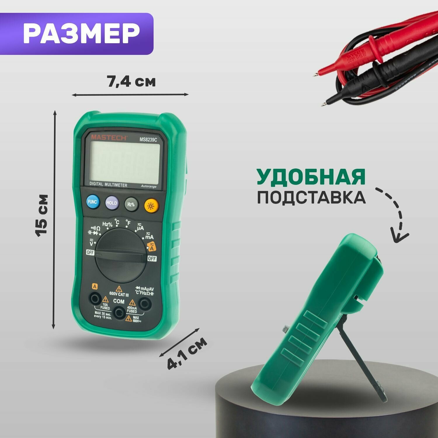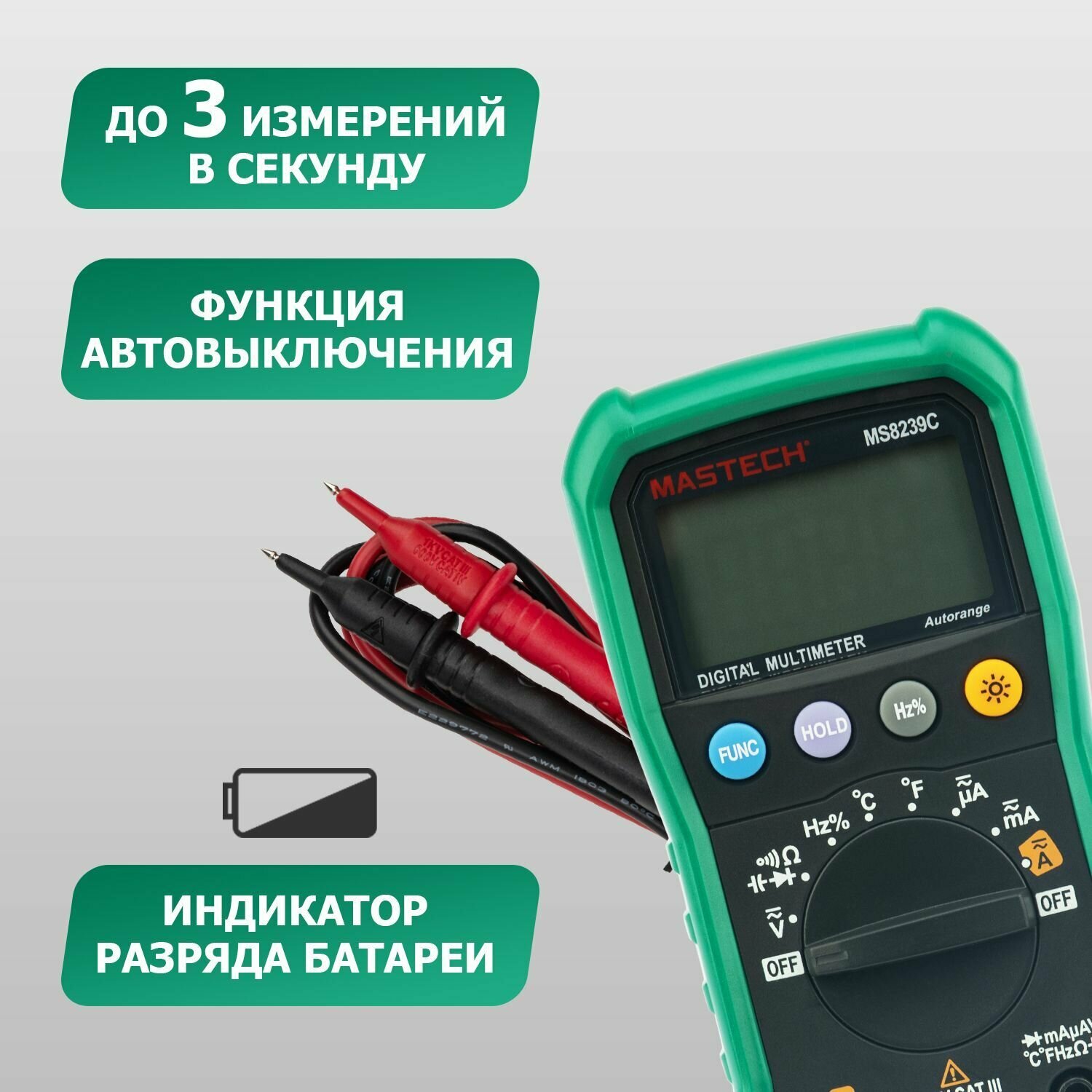 | Особенности | автоматический выбор диапазона измерений, автоматическое выключение, подсветка дисплея, фиксация измерений |
