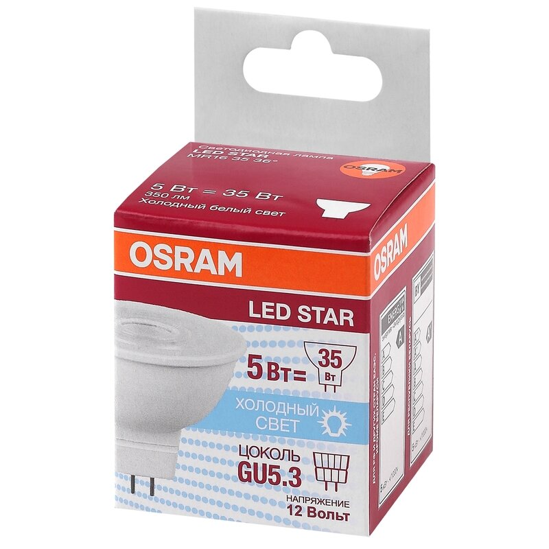 Лампа OSRAM LED Star GU5.3 MR16 12В 5Вт, светодиодная LED, 350 лм, эквивалент 35Вт, нейтральный свет 4000К, прозрачная
