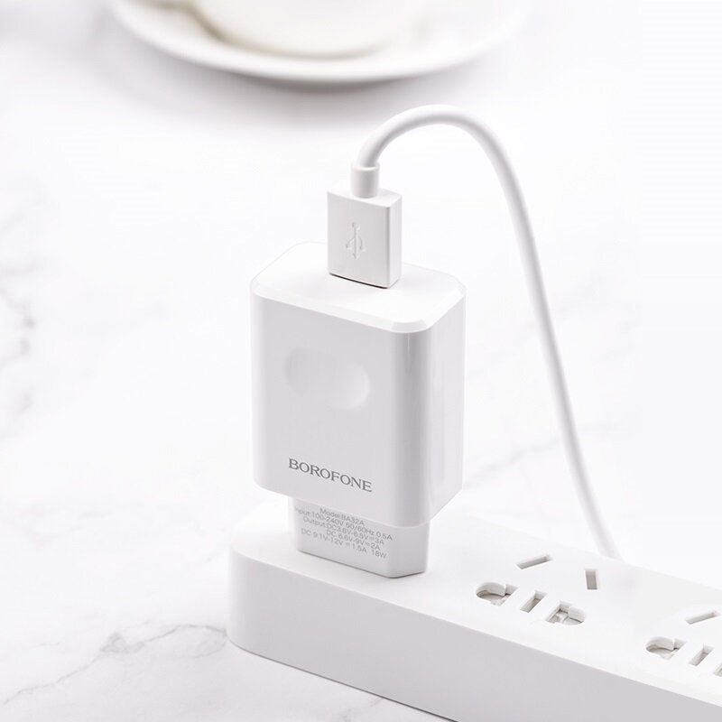 Сетевое зарядное устройство Borofone BA32A Bright Power 1xUSB QC3.0, 18W, 3А + кабель MicroUSB, 1м, белый