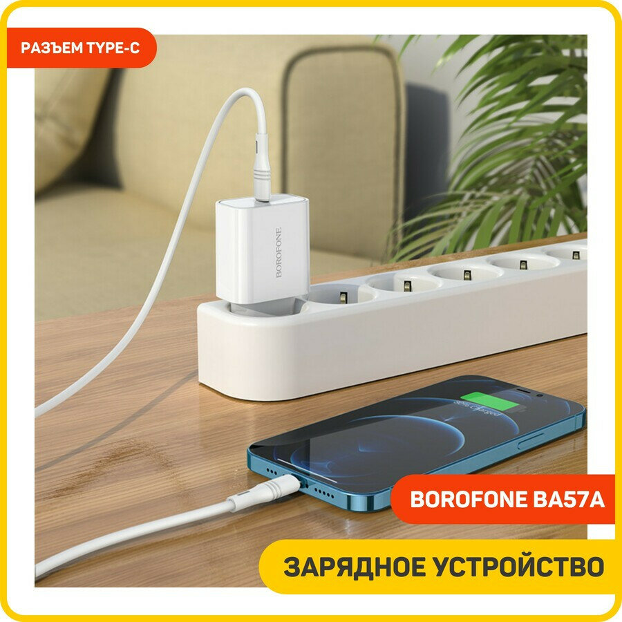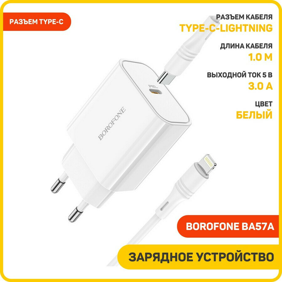 Сетевое зарядное устройство c Type-C, Borofone, BA57A, белое, кабель Type-C - lightning max 2.1A, 20