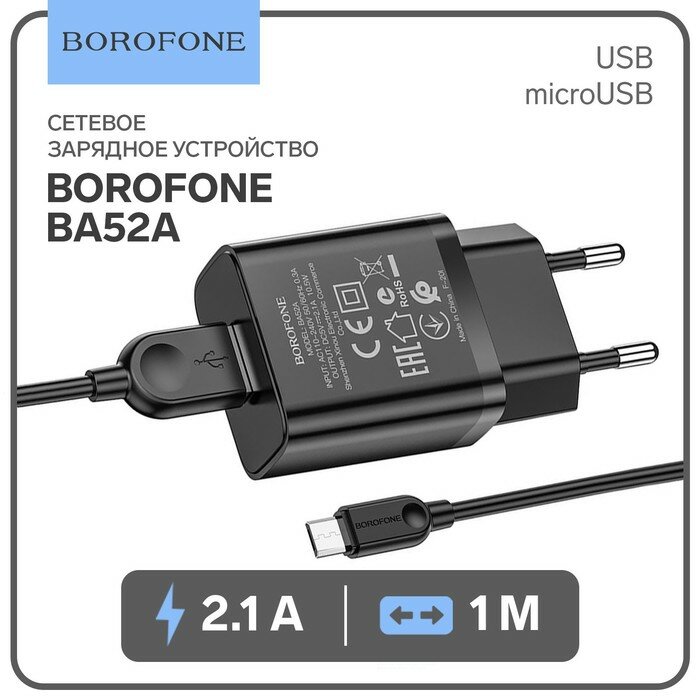 Блок питания сетевой Borofone 1 USB, BA52A, Gamble, 2.1A, пластик, кабель микро USB, цвет: чёрный