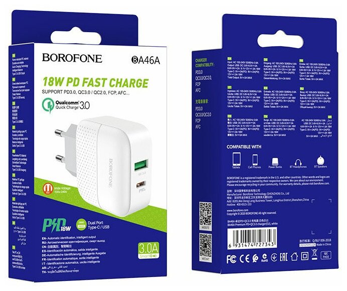 Зарядное устройство сетевое СЗУ BOROFONE BA46A Premium 1xUSB QC3.0 + USB-C PD 18W, 3A (белый)