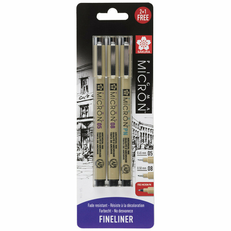 Набор капиллярных ручек Sakura Pigma Micron, 3 штуки (0.45 мм, 0.5 мм, + Ручка Sakura Pigma Micron PN)