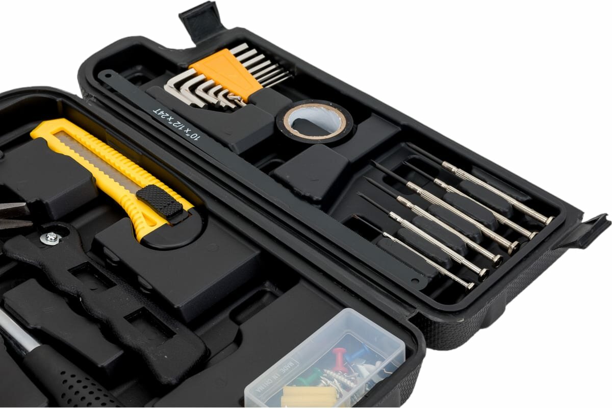 | Ручной инструмент подробно | молоток-гвоздодер 8 унций; строительный нож 18мм; держатель пильного лезвия 6"; пильное лезвие 6"; изолента 5м |